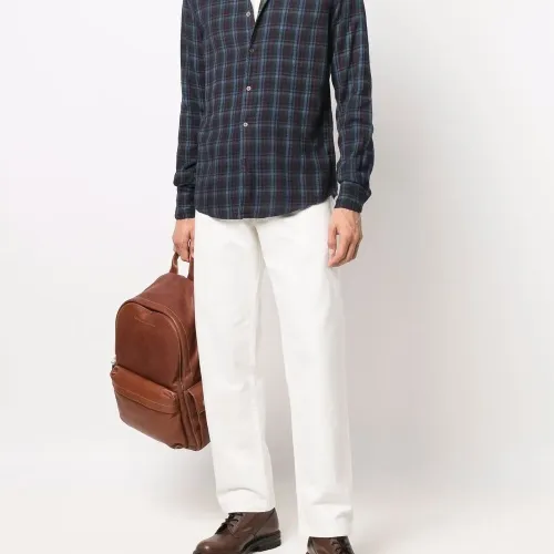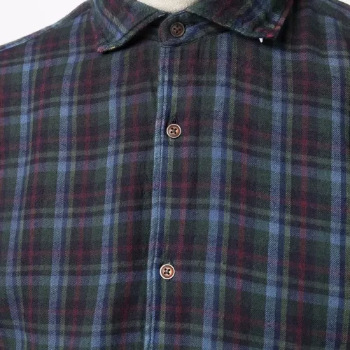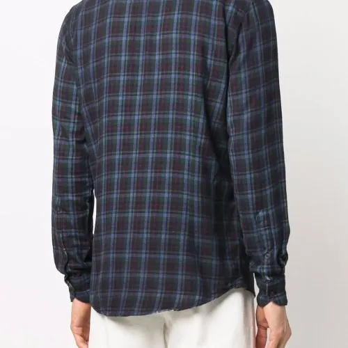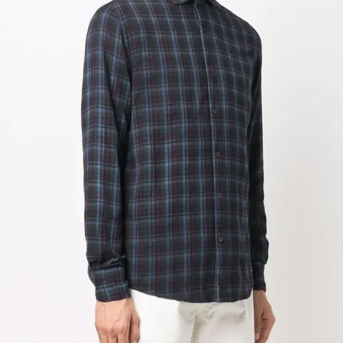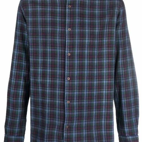 Принт в клетку, косой воротник, застежка на пуговицах спереди, длинные рукава, манжеты на пуговицах и закругленный подол.