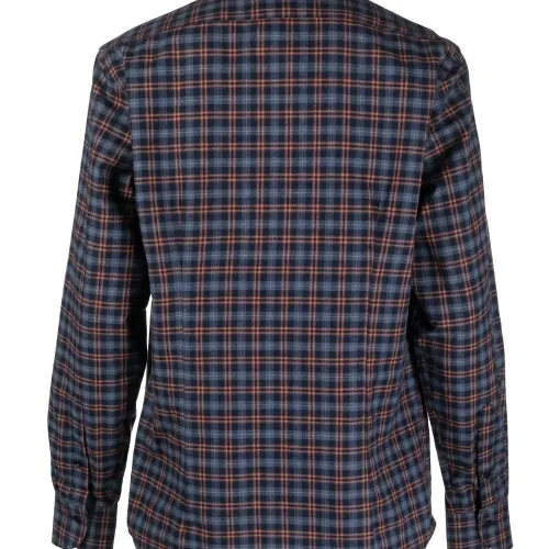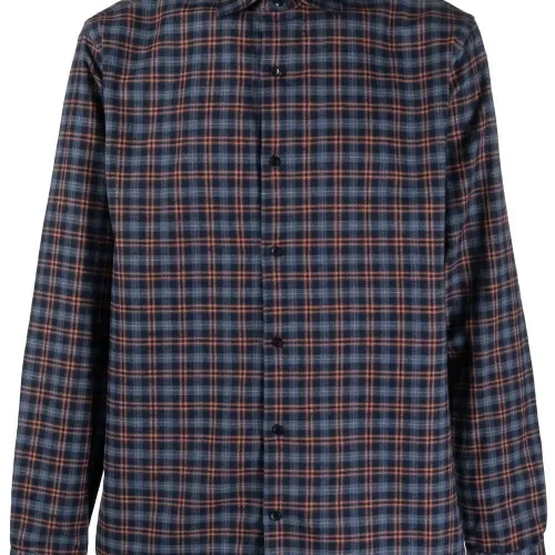 Темно-синий, смесь хлопка и льна, клетчатый узор, длинные рукава и застежка на пуговицах спереди.