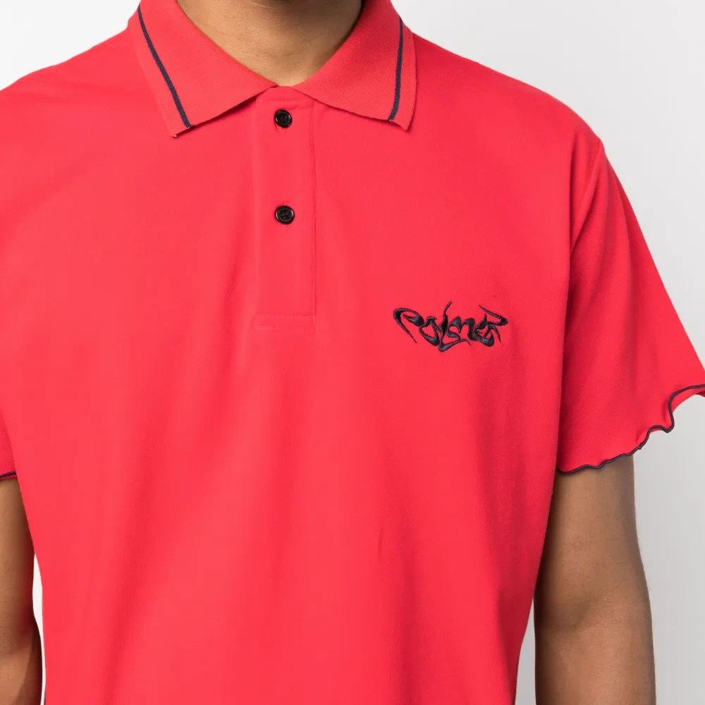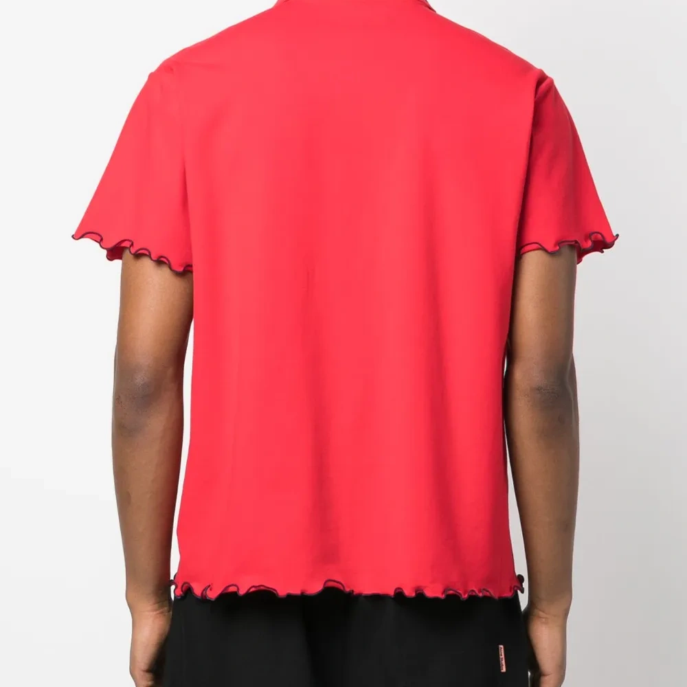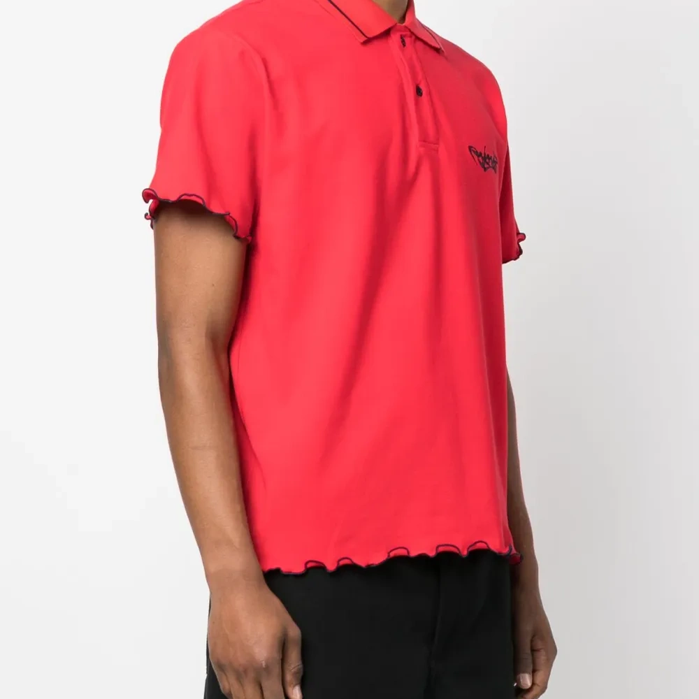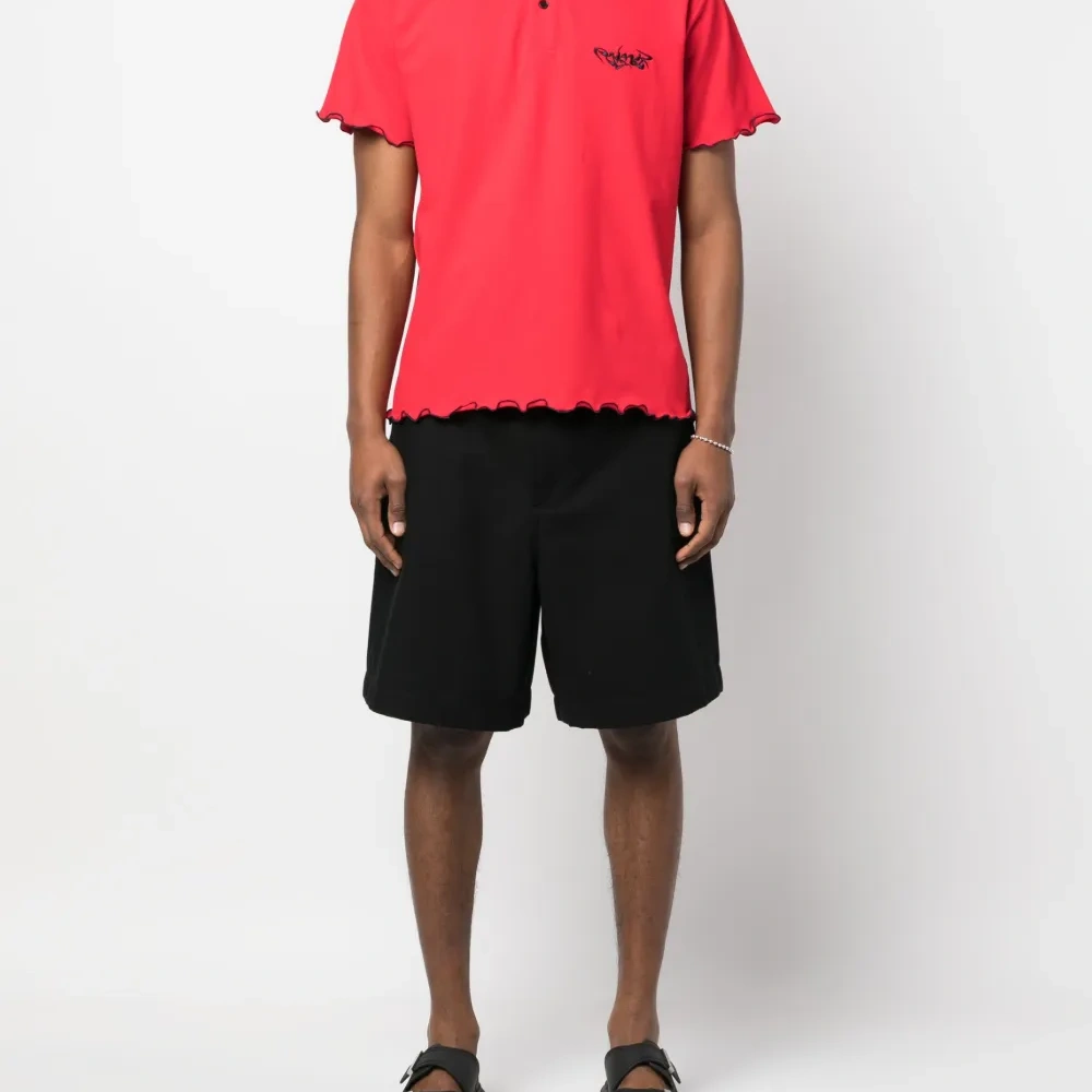Черный/красный, вышитый логотип на груди, края в полоску, воротник поло, планка на пуговицах спереди, короткие рукава и волнистые края.