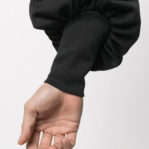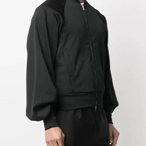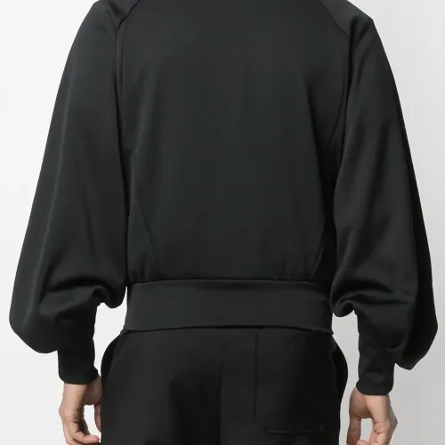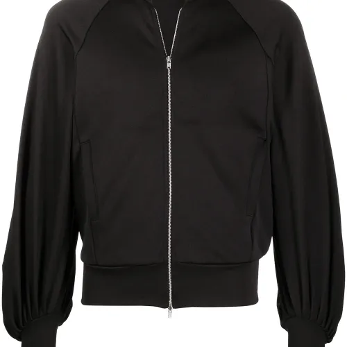 Воротник-стойка в рубчик, застежка на молнии спереди, длинные рукава реглан, манжеты в рубчик, два прорезных кармана по бокам и подол в рубчик. Цвет: черный.