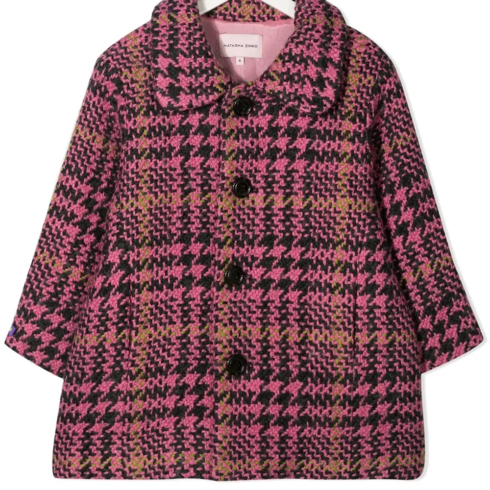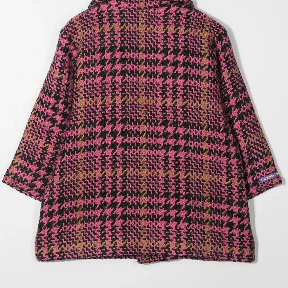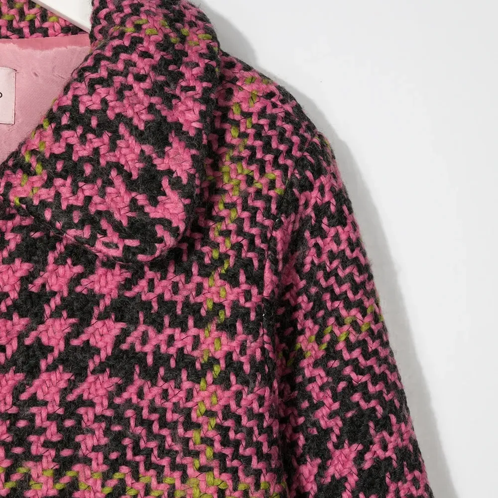 Твидовая ткань, принт в шотландскую клетку, классические лацканы, застежка на пуговицах спереди и длинные рукава.
