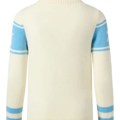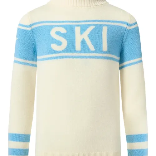 снежно-белая водолазка с лыжным мотивом, полосатыми деталями, звёздными элементами, с длинными рукавами