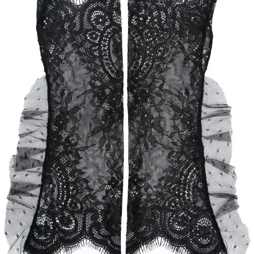 Черный, вставки из цветочного кружева, отделка с оборками и митенки.