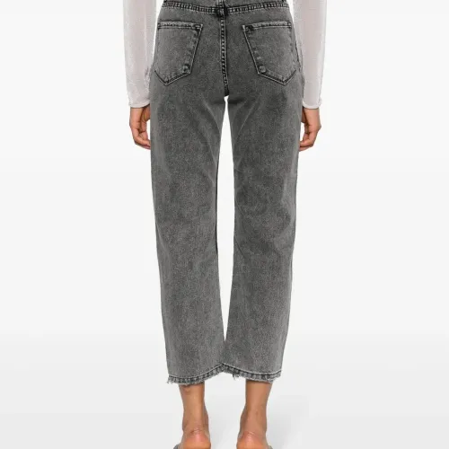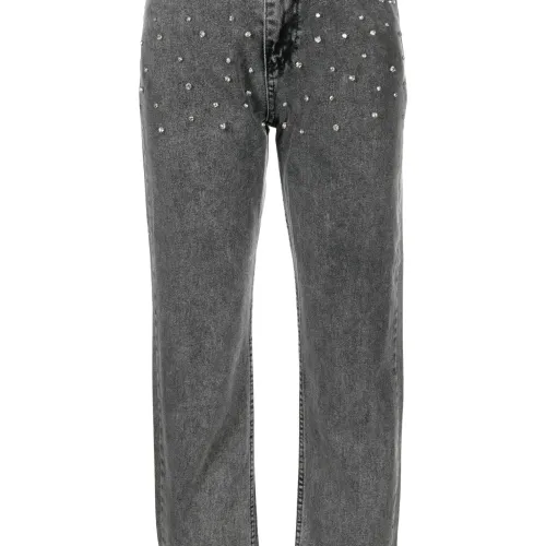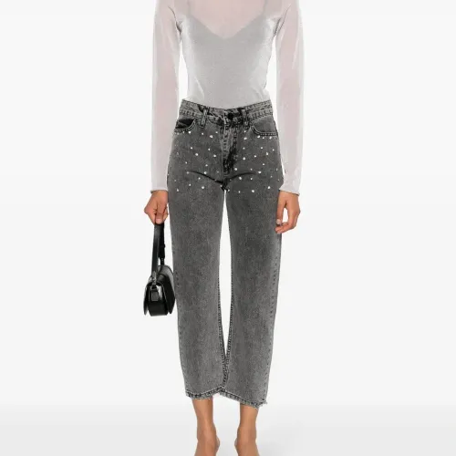 Серый, ткань с твиловым переплетением, темный оттенок денима, декор из кристаллов, декоративная строчка, завышенная талия, петли для ремня, укороченная длина и пять карманов.