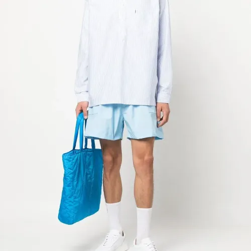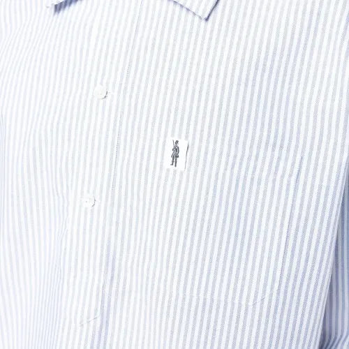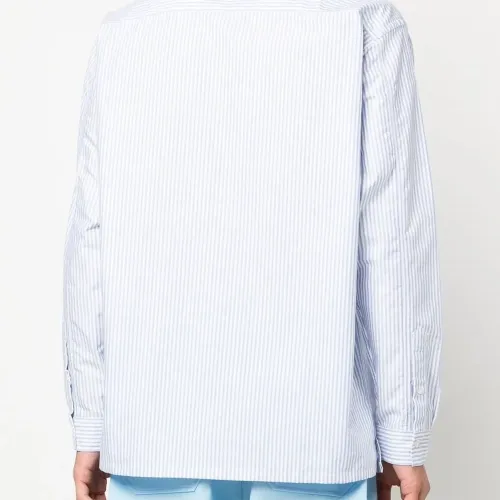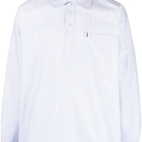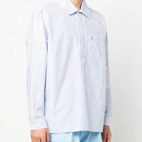 Синий, белый, хлопок, узор в вертикальную полоску, нашивка с логотипом на груди, отложной воротник, застежка на пуговицах спереди, длинные рукава, манжеты на пуговицах, прямой подол и нагрудный накладной карман.