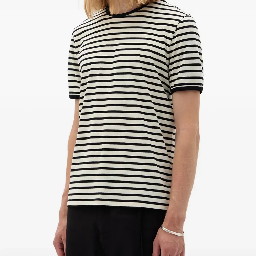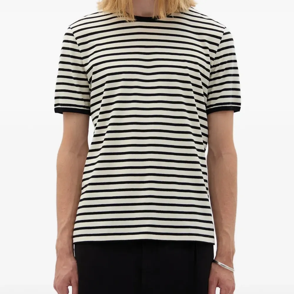 чёрно-белая футболка в полоску с круглым вырезом и короткими рукавами