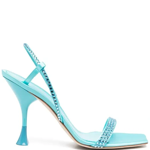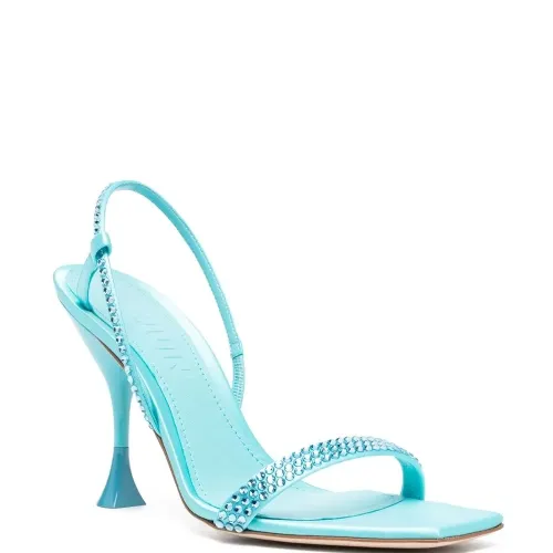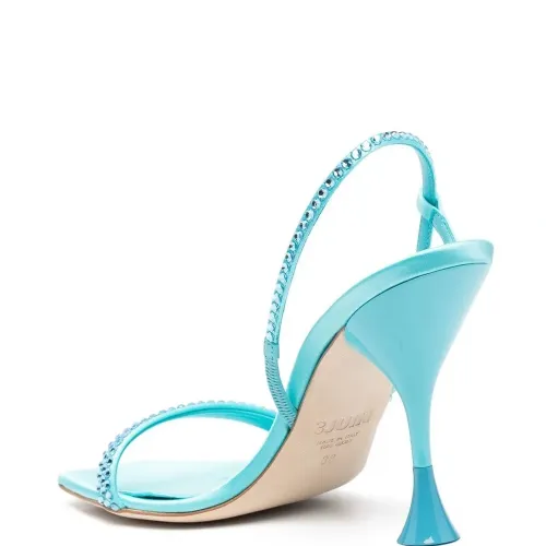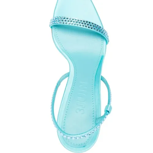 Бирюзовый, телячья кожа, декор из кристаллов, открытый носок, квадратный носок, ремешок на пятке и высокий скульптурный каблук.