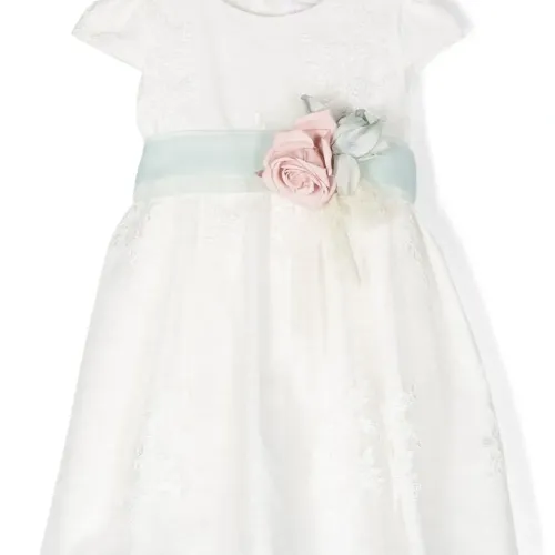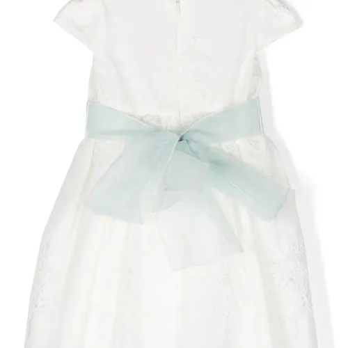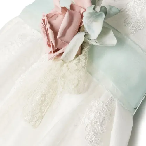 Белый, синий, смесовый хлопок, верхний слой из тюля, аппликация из кружева с цветочным узором, цветочная деталь, круглый вырез, потайная застежка на молнии сзади, рукава кап, кулиска на талии и пышная юбка.