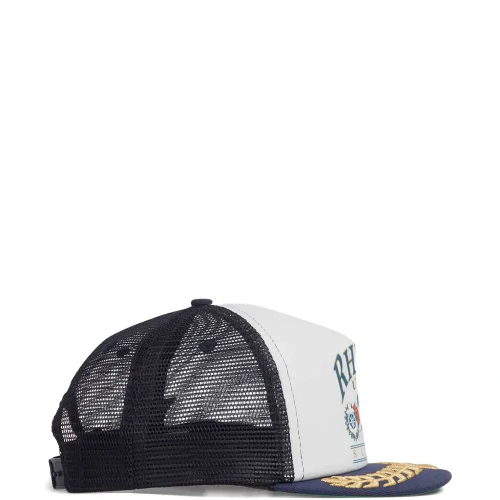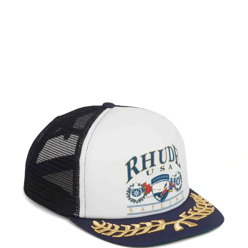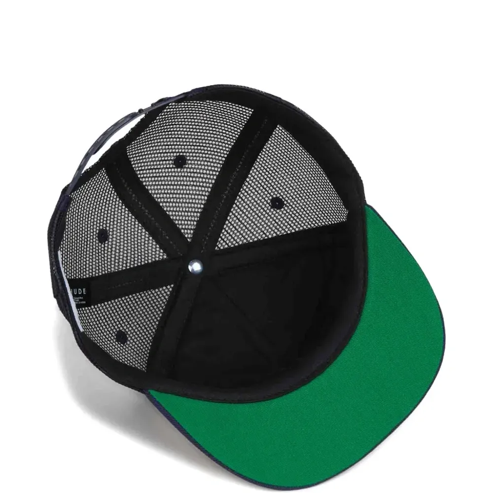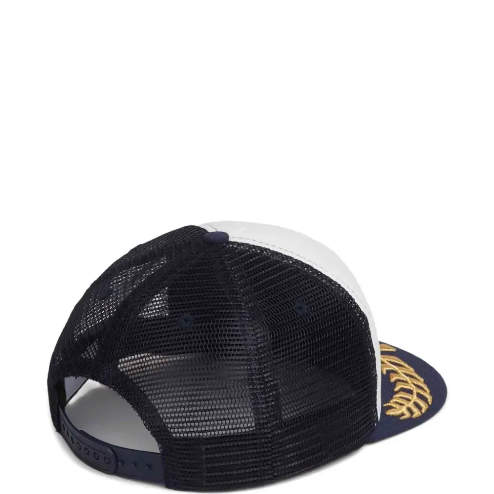 темно-синяя кепка с графическим принтом, сетчатыми вставками, золотистой вышивкой, плоским козырьком и регулируемым ремешком
