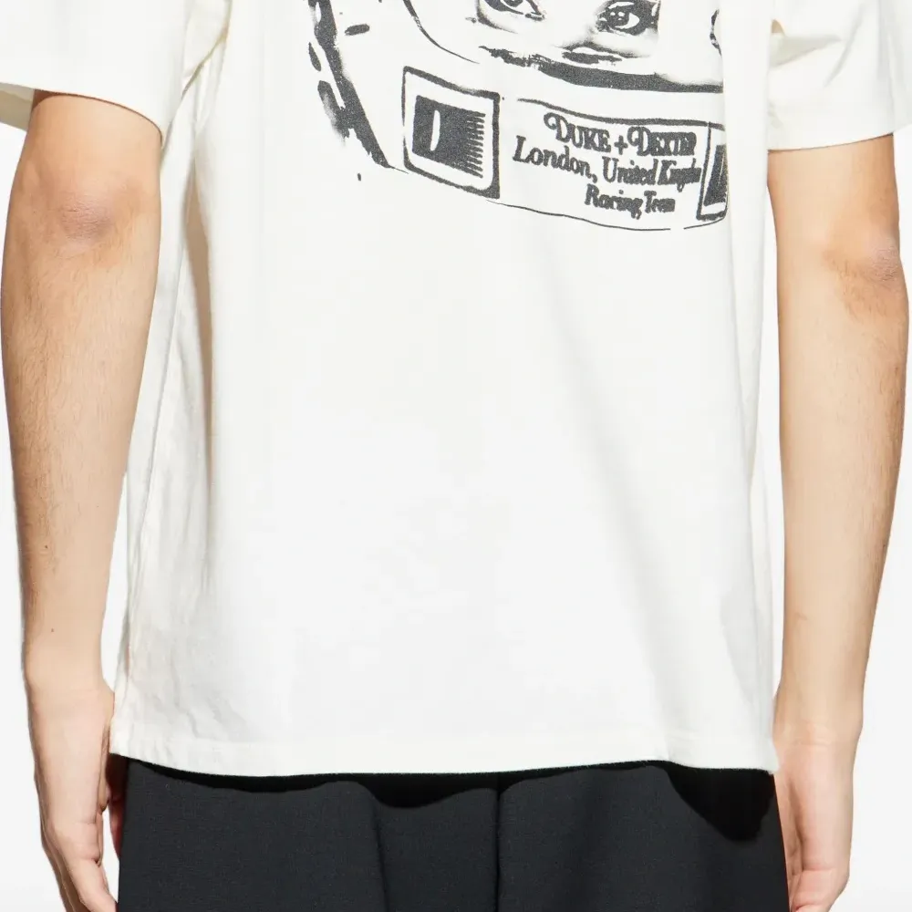 белая футболка с графическим принтом, круглым вырезом, короткими рукавами и прямым подолом