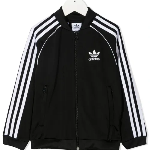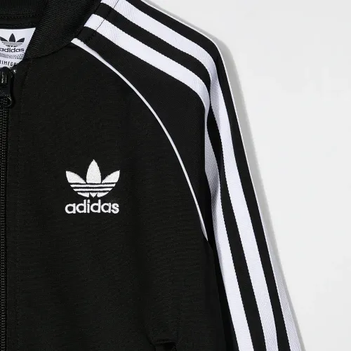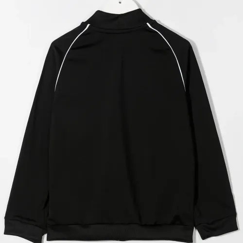 Декор с тремя полосками, вышитый логотип на груди, застежка на молнии спереди, высокий воротник и длинные рукава. Цвет: черный.