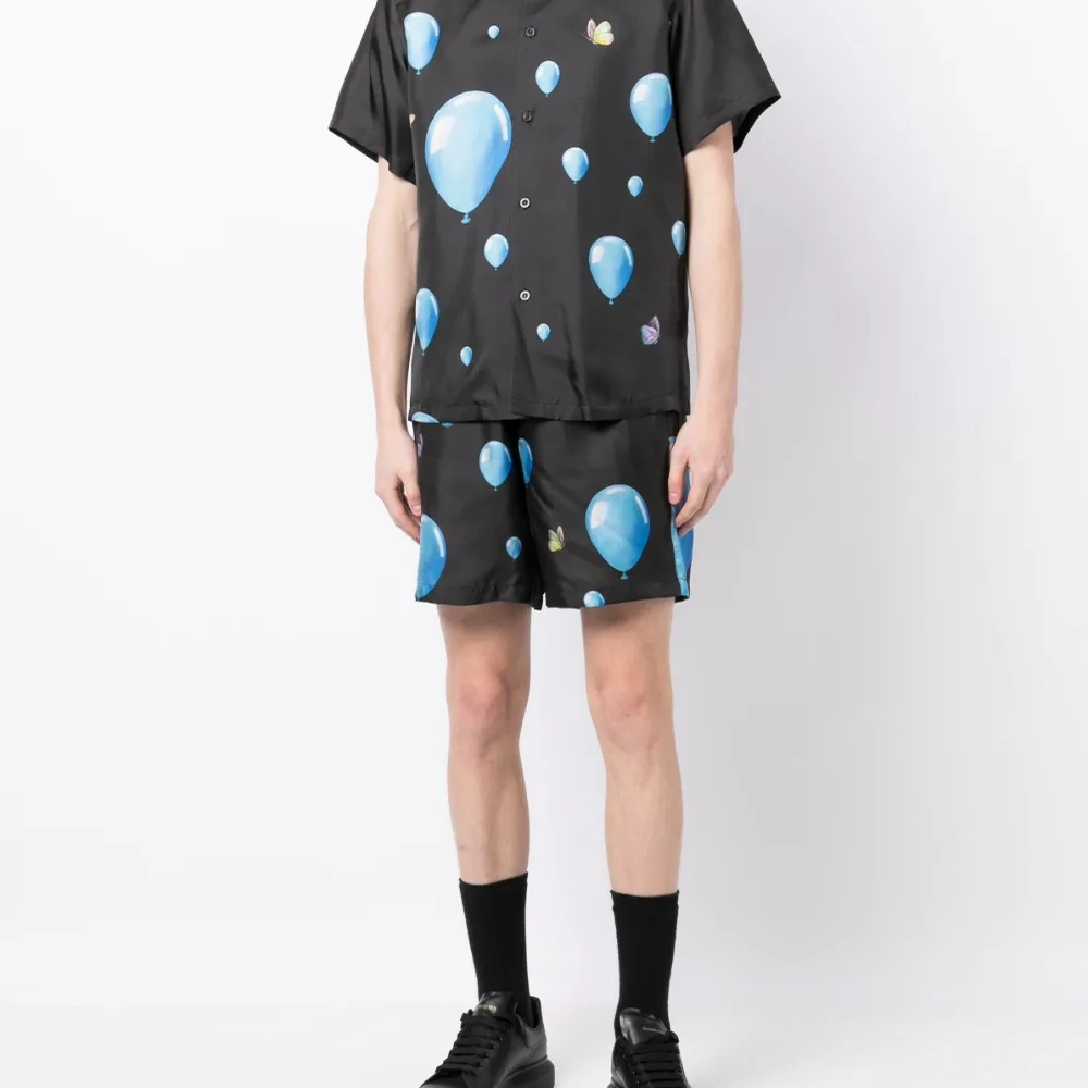 Сплошной графичный принт, эластичный пояс, два вшитых кармана по бокам и задние карманы с листочкой.