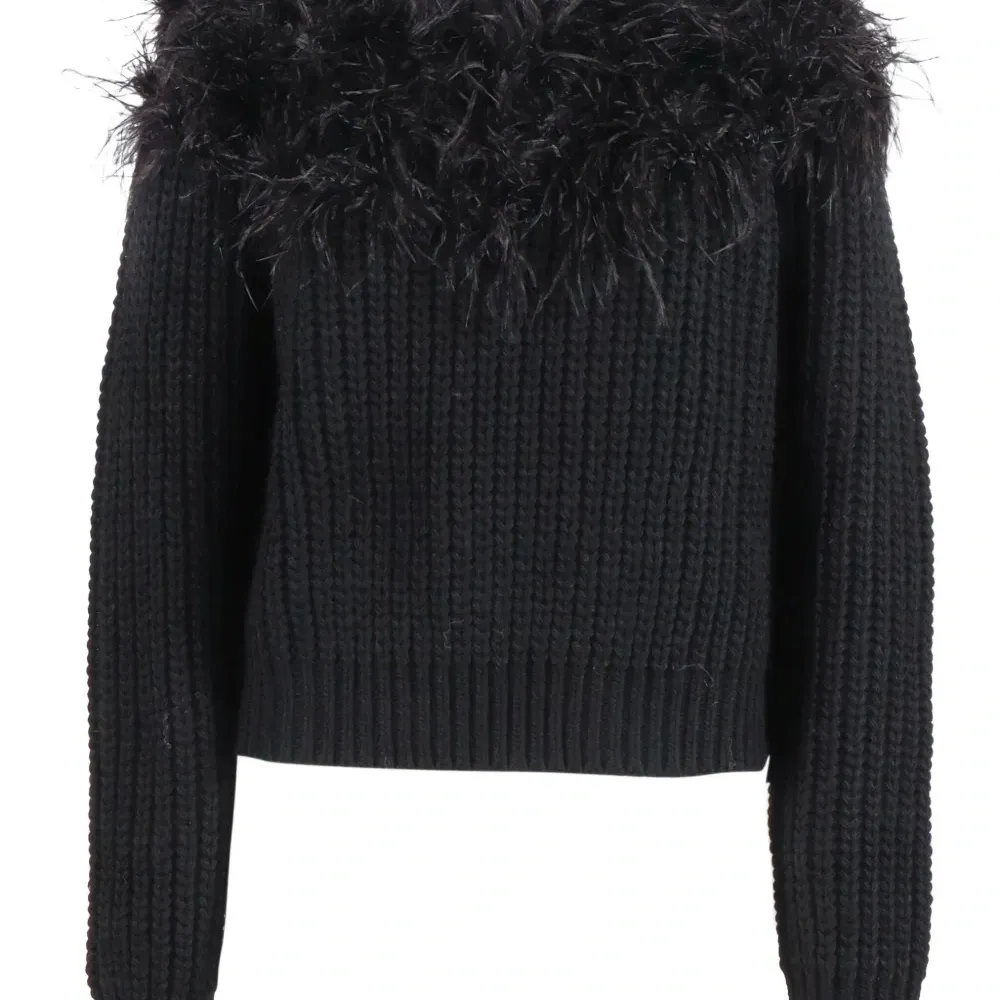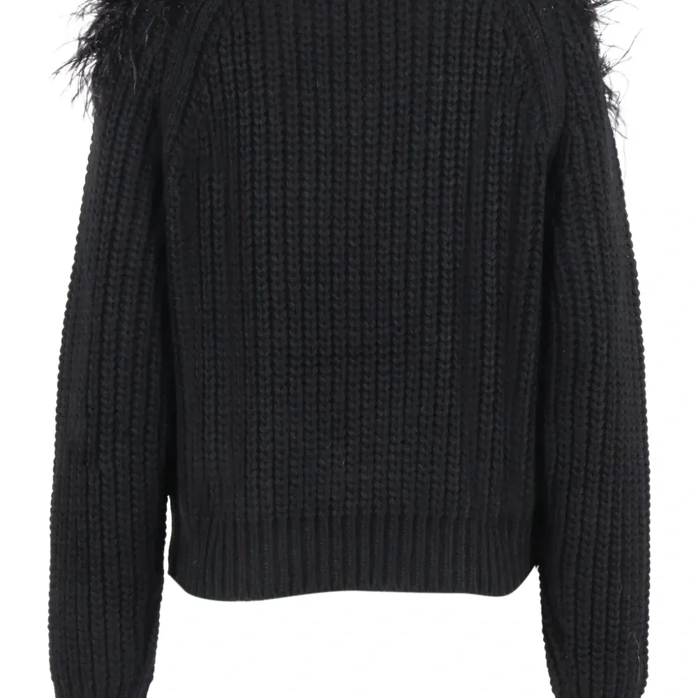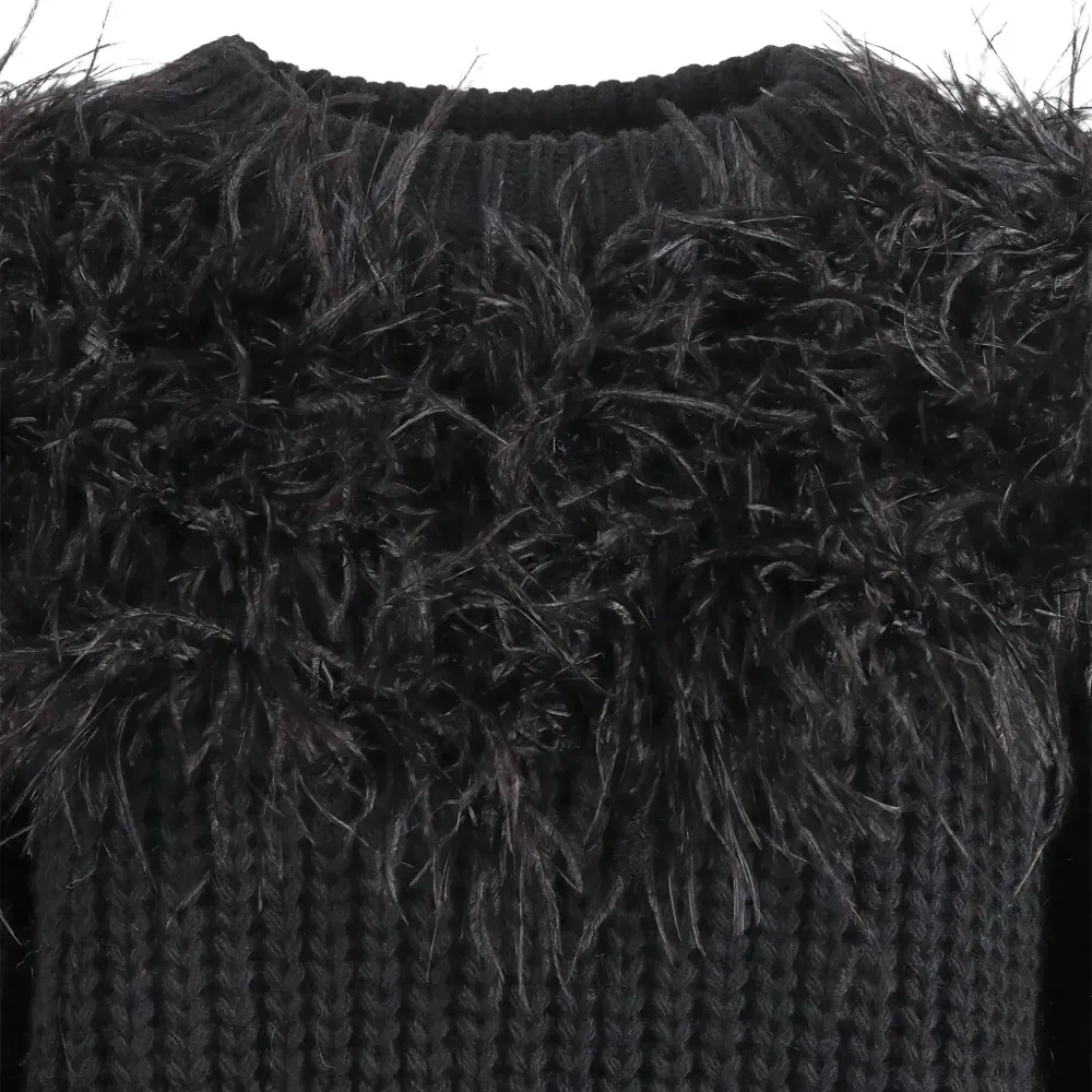 черный вязаный джемпер с отделкой из перьев, круглым вырезом, длинными рукавами и свободным кроем