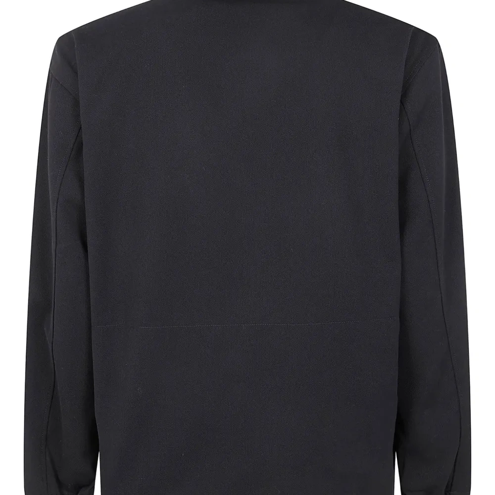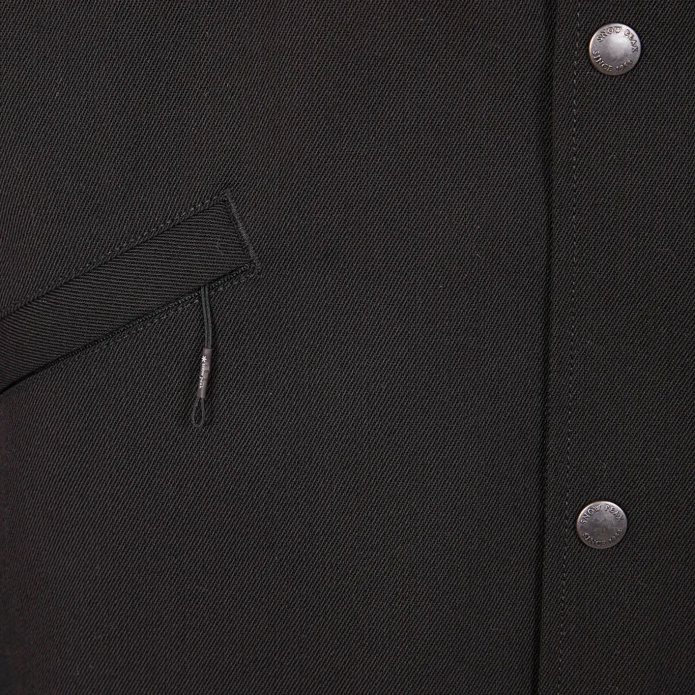 черная рубашка с застежкой на пуговицы, отложным воротником, длинными рукавами, регулируемым подолом и боковыми карманами на молнии