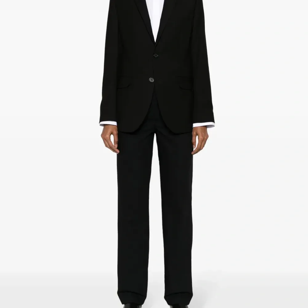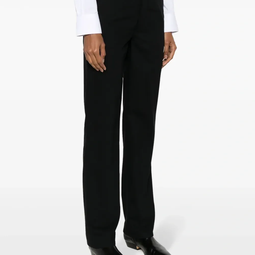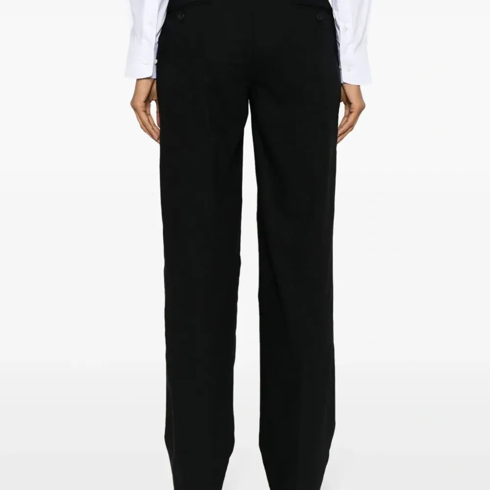 Черный, шерсть, вырезные детали, узкий крой, стрелки, петли для ремня, два прорезных кармана по бокам, потайная застежка на молнии и пуговицах, смещенная застежка на пуговицах спереди и два прорезных кармана на пуговицах сзади.