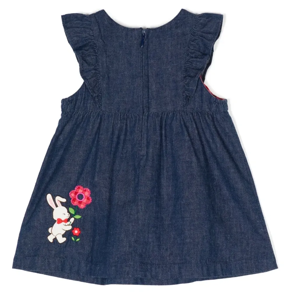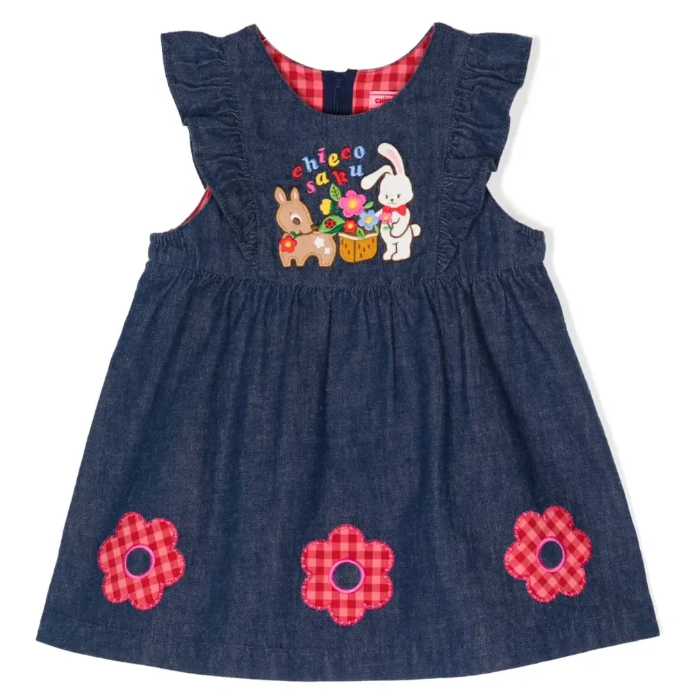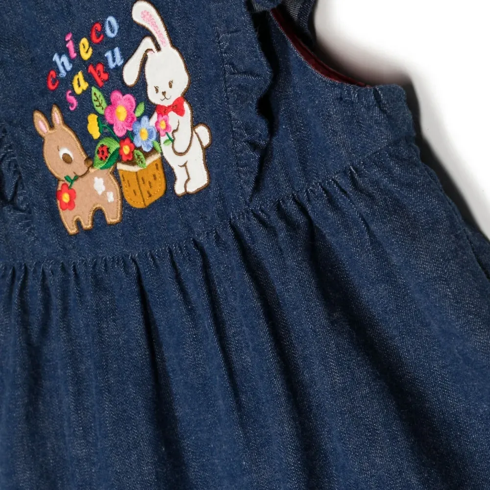 Синий, хлопок, деним, цветочная вышивка, вышитый узор, цветочный узор, круглый вырез, застежка на молнии сзади, короткие рукава и прямой подол.