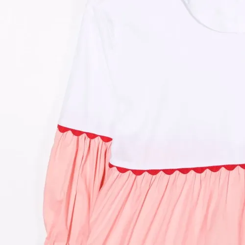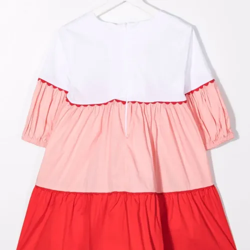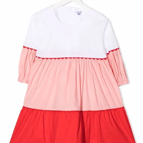 Дизайн колор-блок, ярусная юбка, дизайн со сборками, рукава три четверти, потайная застежка на молнии сзади, круглый вырез и прямой подол.