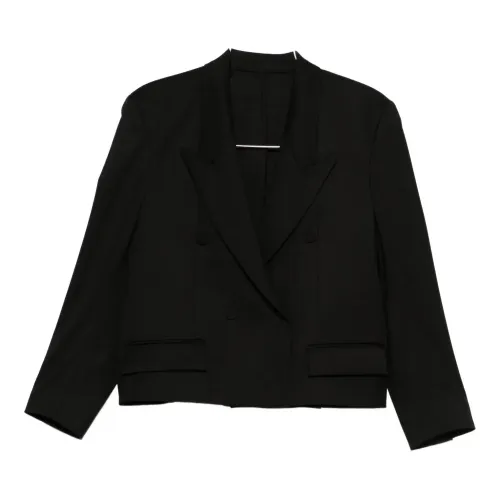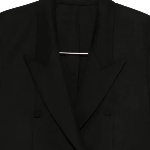 черный двубортный пиджак с острыми лацканами, передними клапанными карманами, застежкой на пуговицы и длинными рукавами