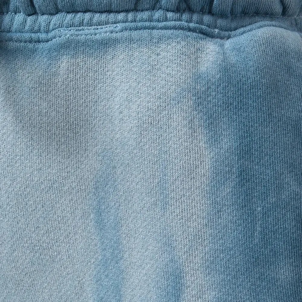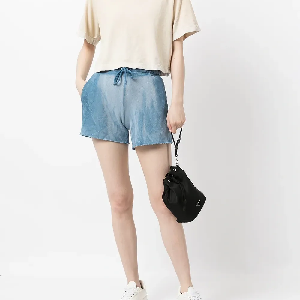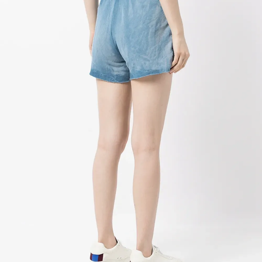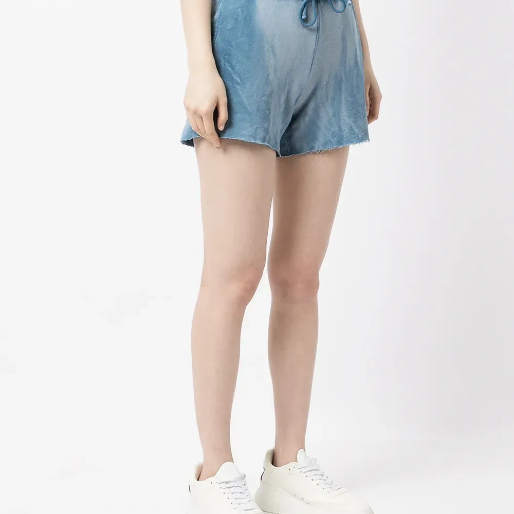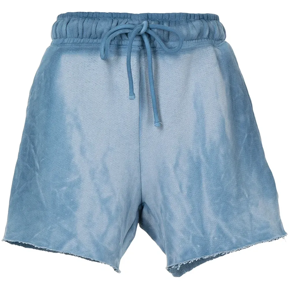 Эффект потертости, прорезные карманы по бокам, необработанный подол и эластичный пояс на шнурке. Цвет: синий.