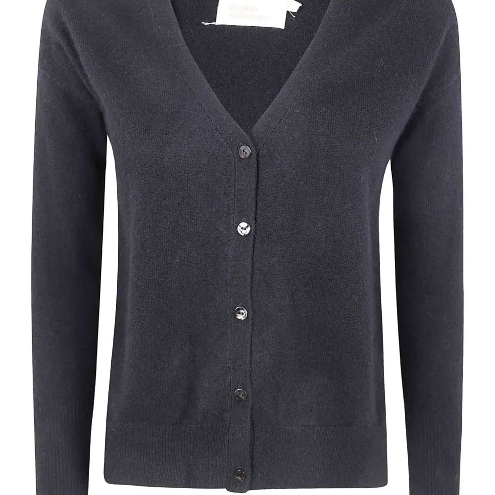 чёрный цвет, V-образный вырез, застёжка на пуговицы спереди, длинные рукава, рубчатый край, рубчатые манжеты