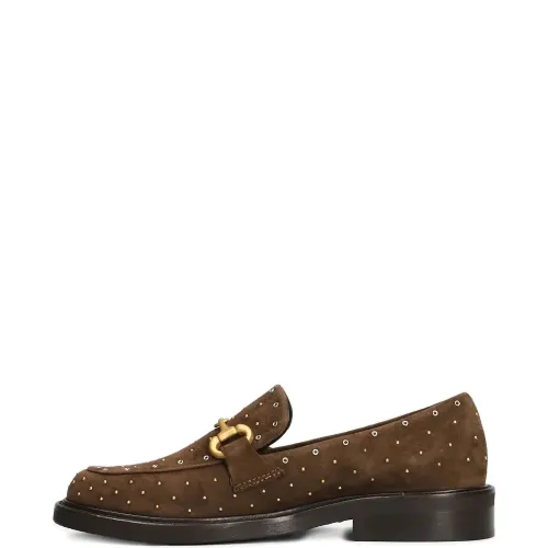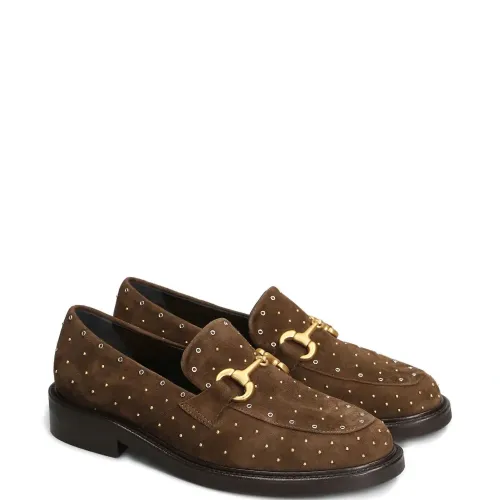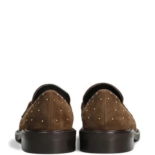 коричневый, фурнитура золотистого оттенка, украшения в виде заклёпок, модель без застёжек, круглый носок, плоская подошва