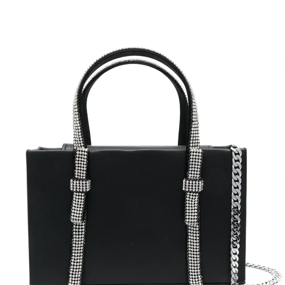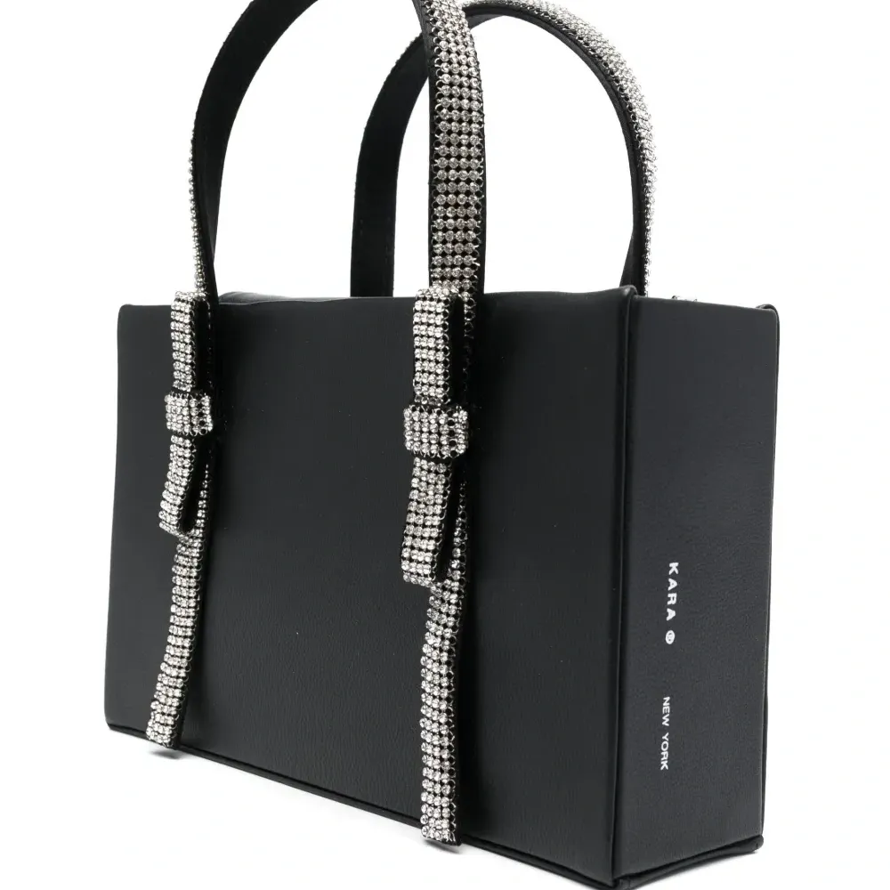 Черный, овечья кожа, гладкая текстура кожи, декор из кристаллов, бант, две верхние ручки, ремешок-цепочка на плечо, потайная застежка на магните, основное отделение, атласная подкладка и серебристая фурнитура.