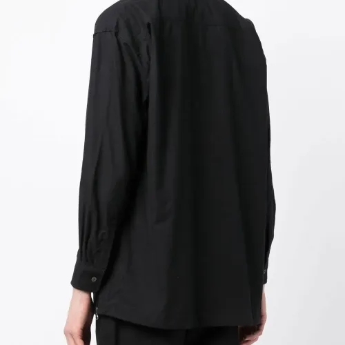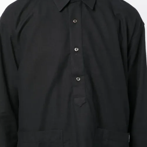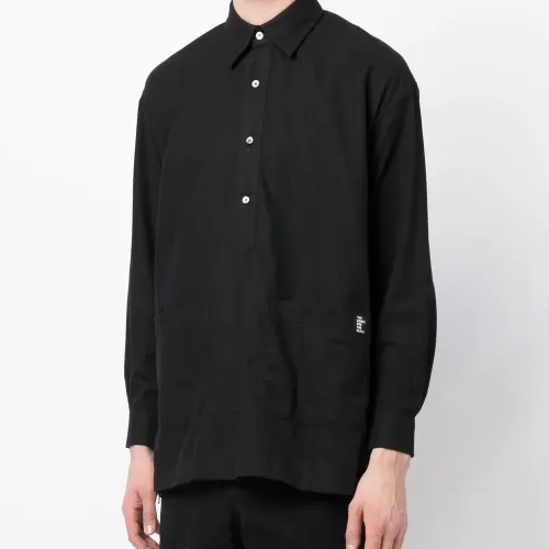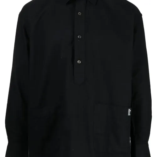 Черный, хлопок, нашивка с логотипом сбоку, классический воротник, планка на пуговицах спереди, длинные рукава и два передних кармана.