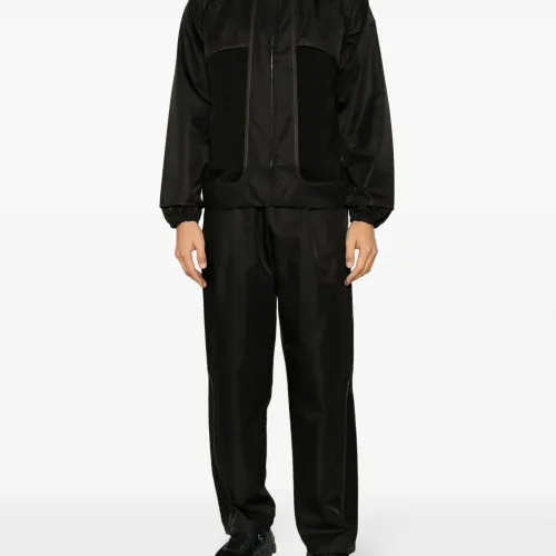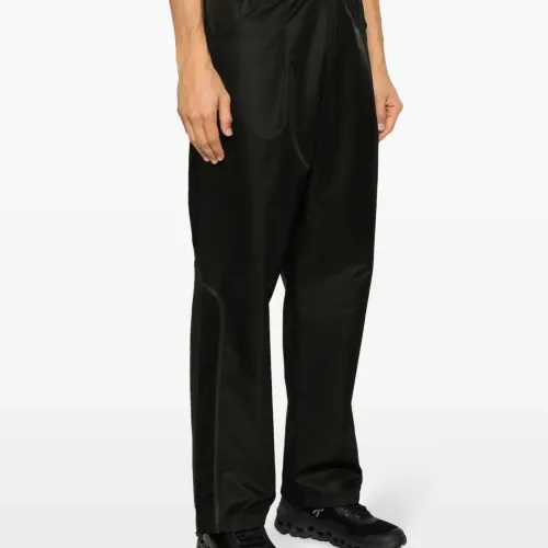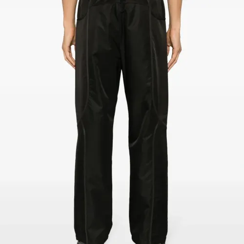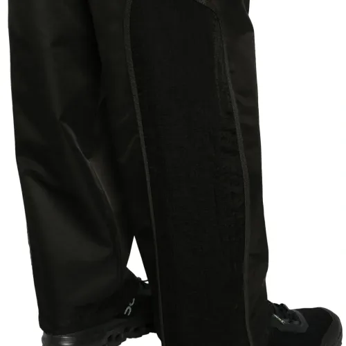 Черный, глянцевая фактура, вставки, складки, эластичный пояс, прямой крой, два накладных кармана сзади и прямой подол.