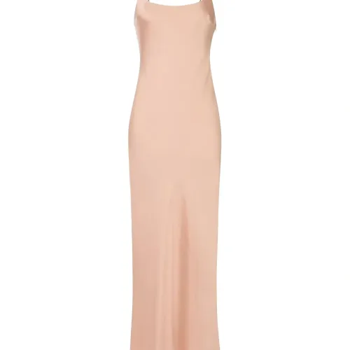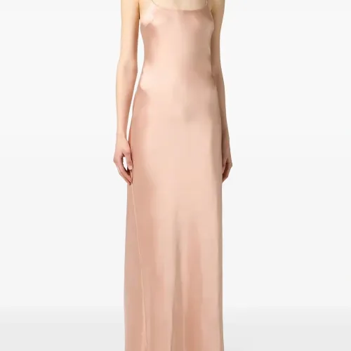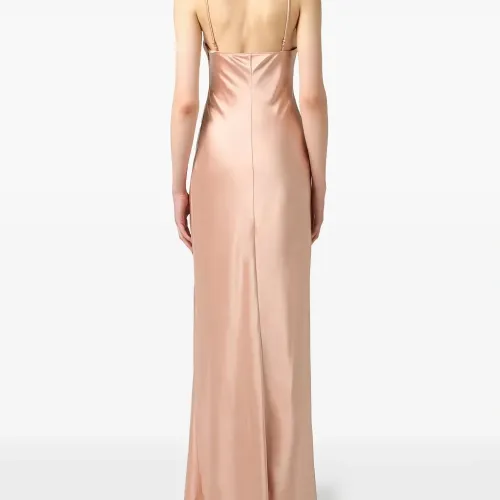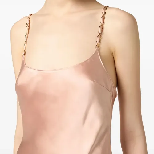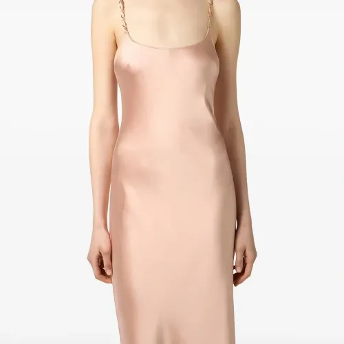 светло-розовая атласная ткань, украшение в виде цепочки, регулируемые бретели, длина до пола