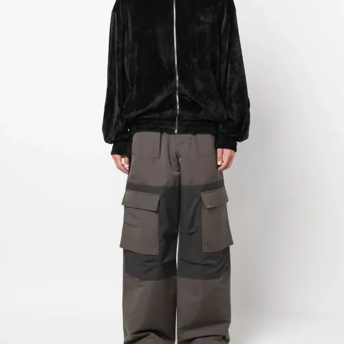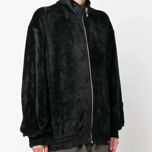 Черный, эластичный материал, бархатистое покрытие, вышитый логотип на груди, вышитый логотип сзади, высокий воротник, застежка на молнии спереди, приспущенные плечи, длинные рукава, эластичные манжеты, эластичный подол, два прорезных кармана по бокам и прямой подол.