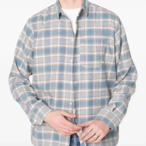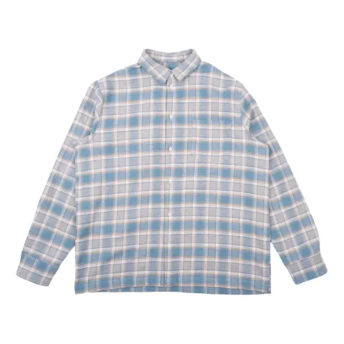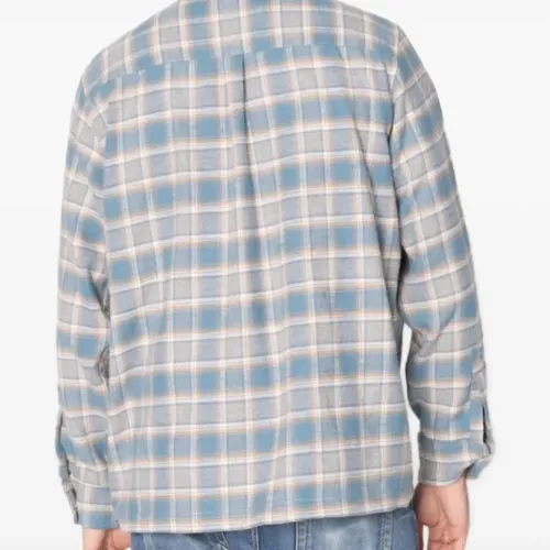 выцветшая синяя рубашка в клетку с нагрудным карманом, застёжкой на пуговицы, длинными рукавами и манжетами на пуговицах