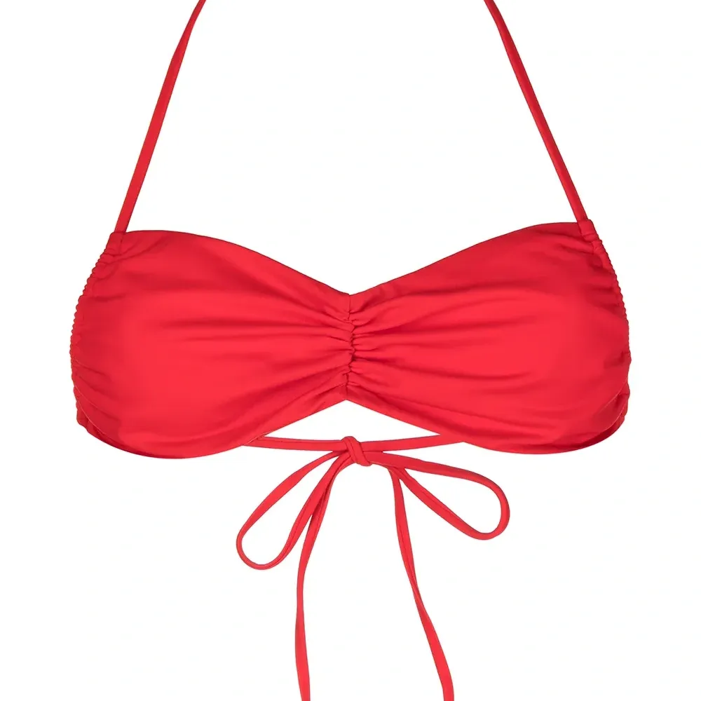 Модель бандо, вырез-петля халтер, застежка на завязке сзади и эластичная модель. .