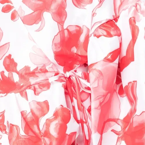 Светло-красный, белый, эластичный материал, сплошной цветочный принт, модель на запах, завязки по бокам, пышные рукава три четверти и подол с баской.