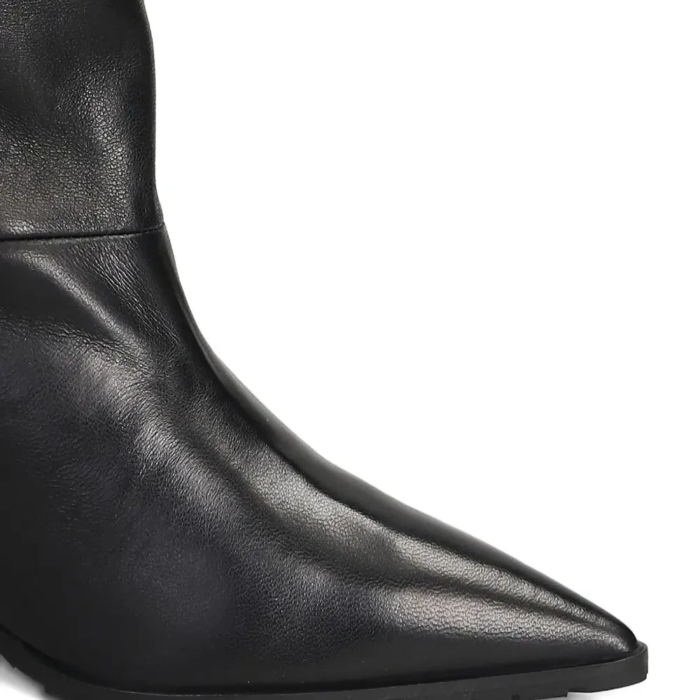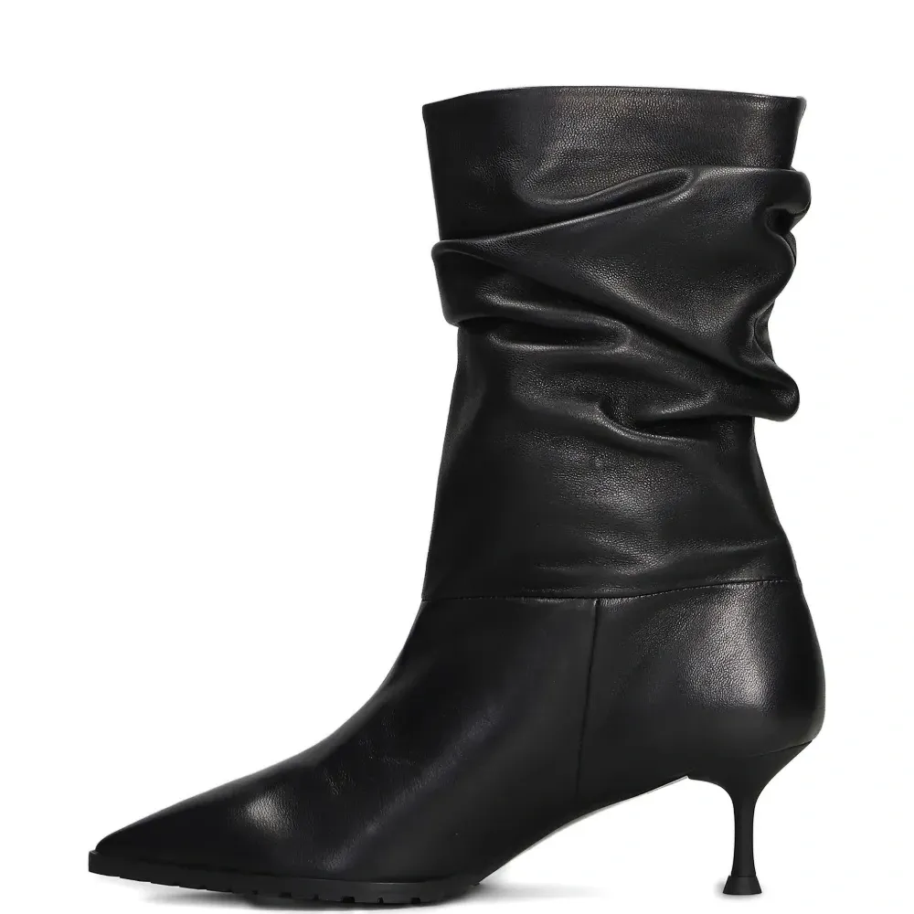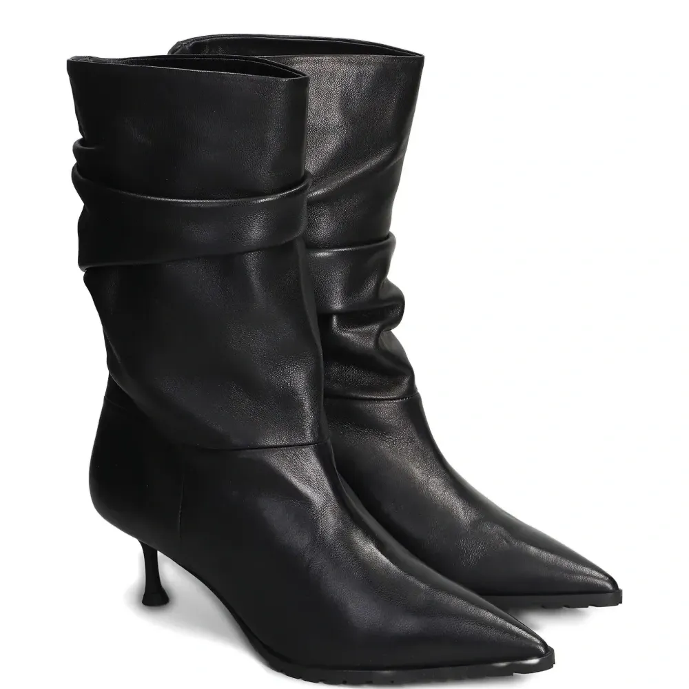 чёрные туфли-лодочки на шпильке с заострённым мысом, сборкой и гладкой отделкой