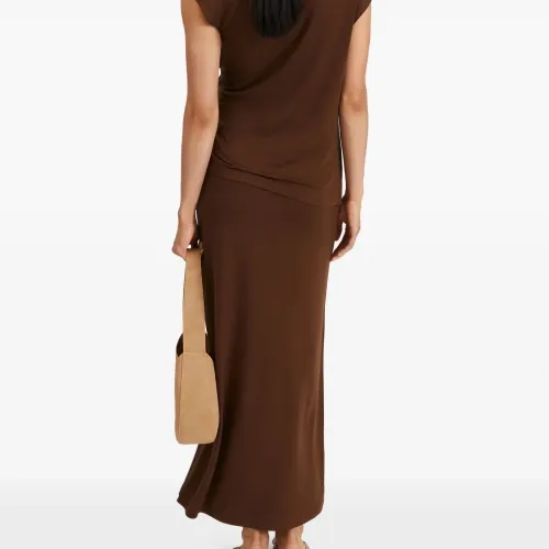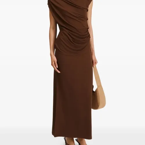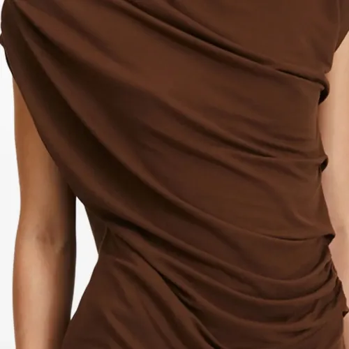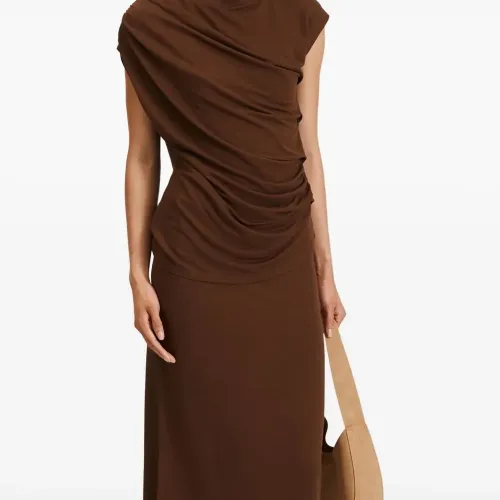 коричневое платье со драпировкой, короткими рукавами, круглым вырезом и присборенной талией