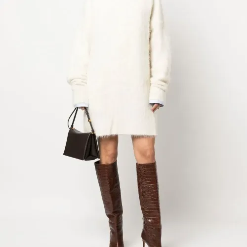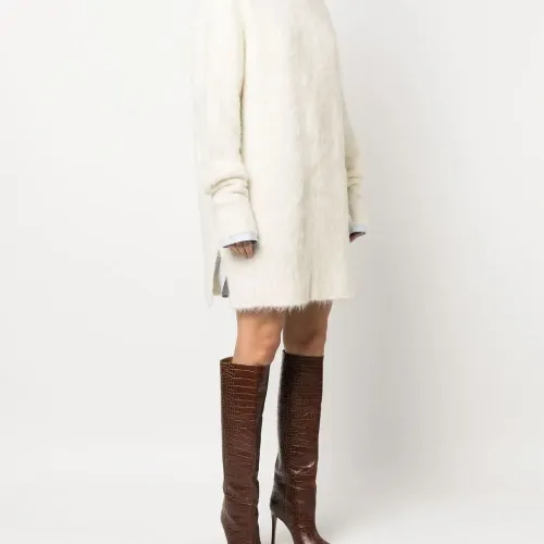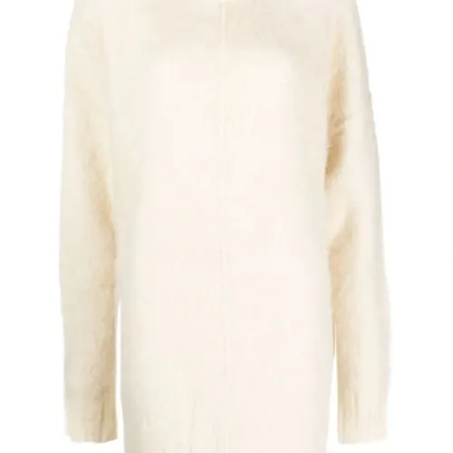 Кремовый, смесовая шерсть альпаки, трикотажный материал, матовое покрытие, вытачки, приспущенные плечи, края в рубчик, круглый вырез, длинные рукава, прямой подол и длина выше колена.