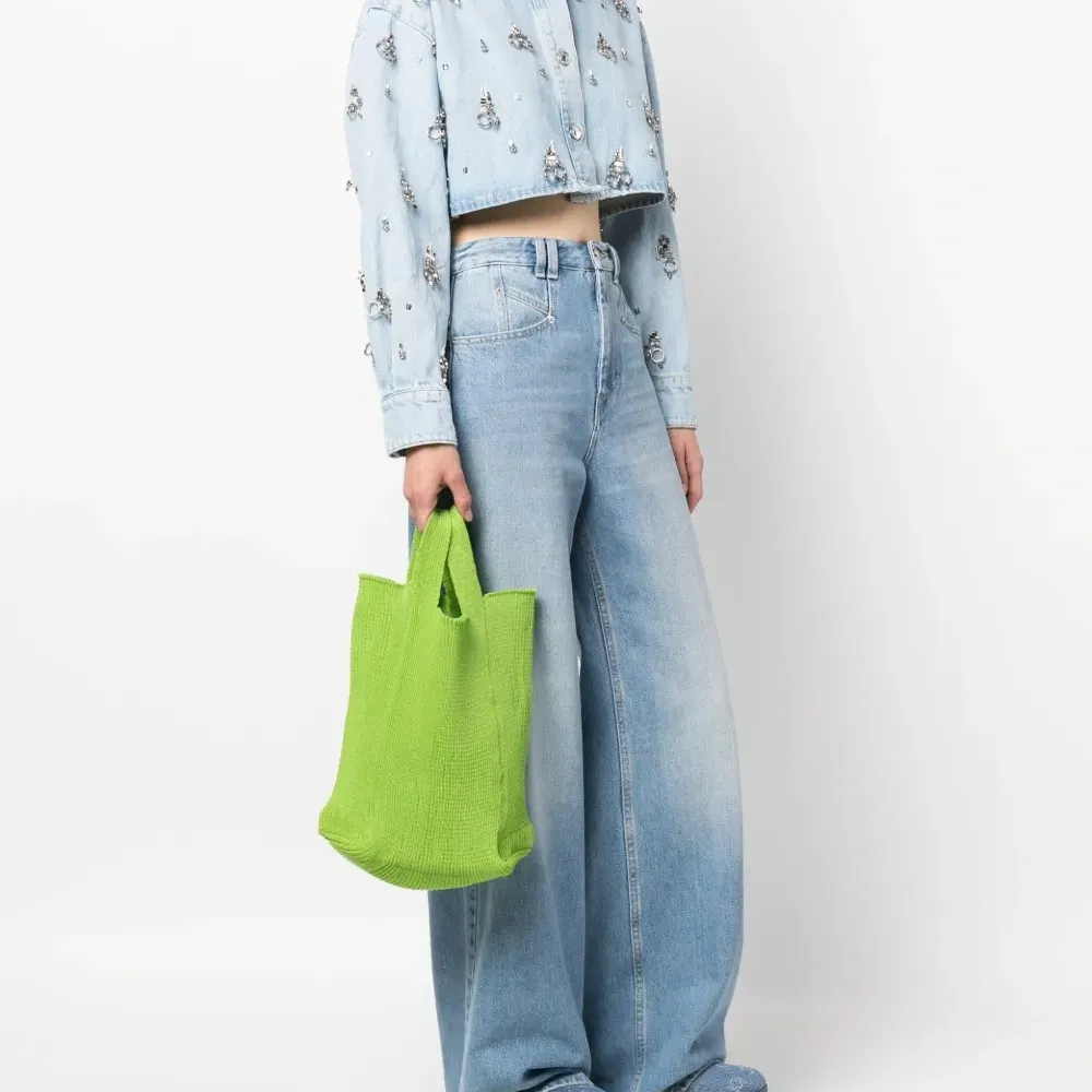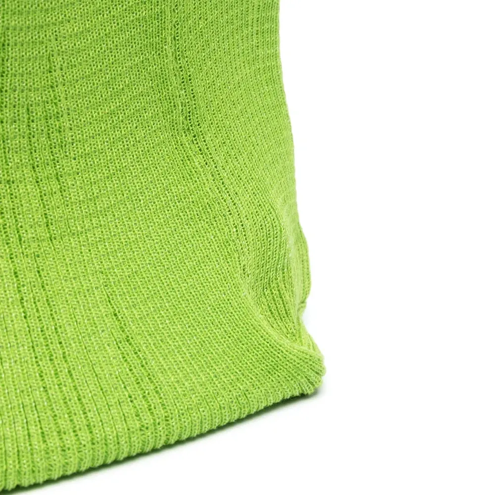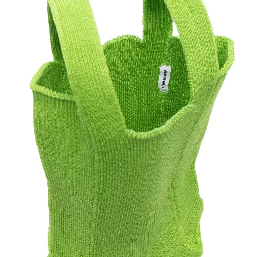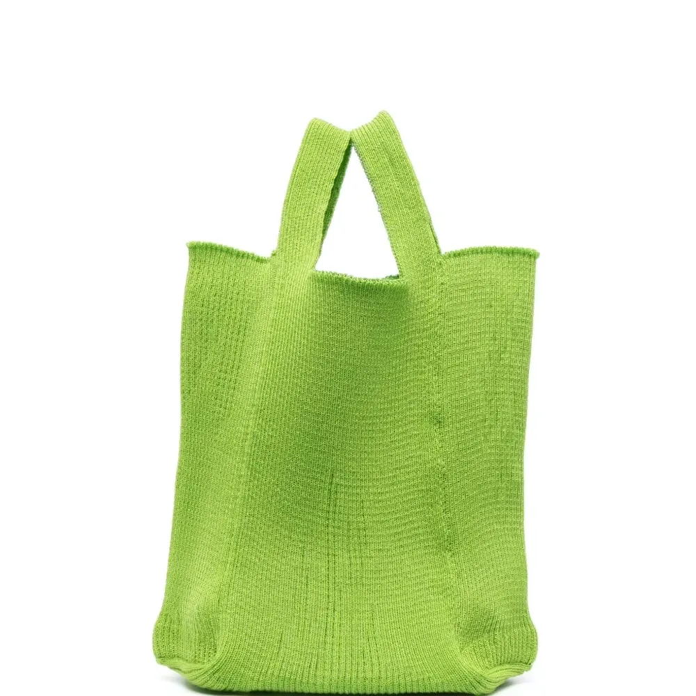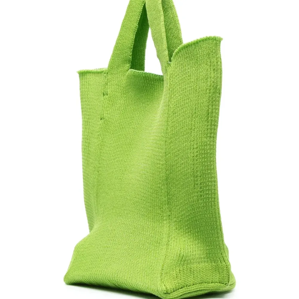 Цвет зеленого яблока, хлопок, трикотажный материал, нашивка с логотипом внутри, прямоугольная форма, дизайн с открытым верхом, две плоские верхние ручки и основное отделение.