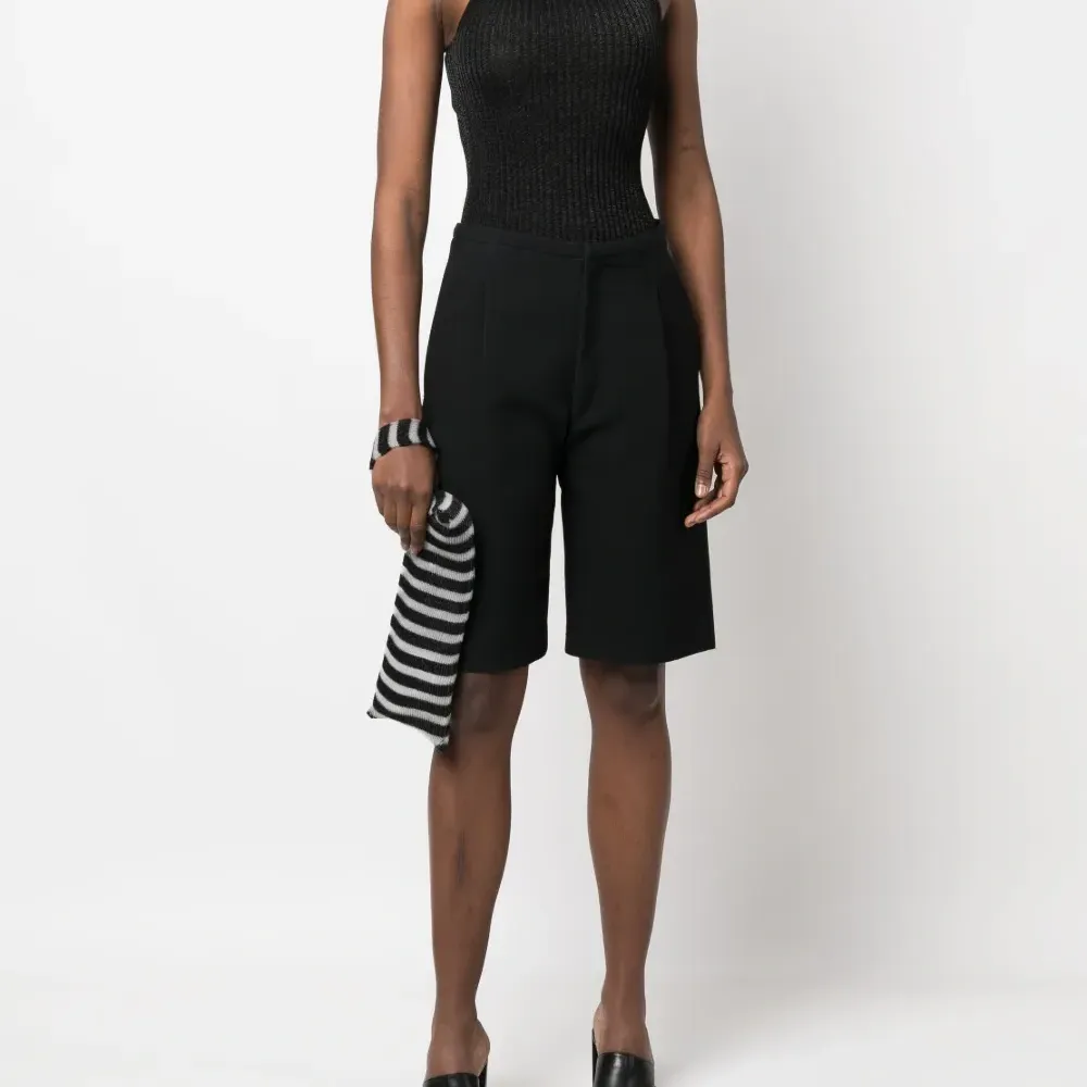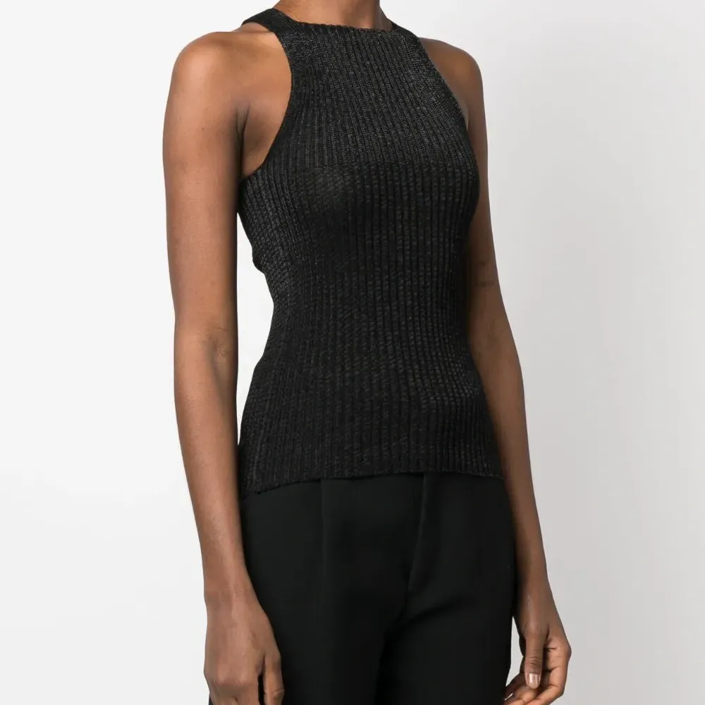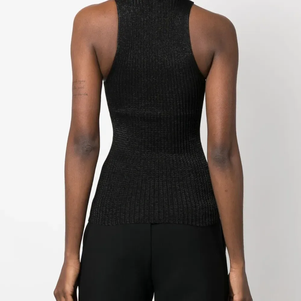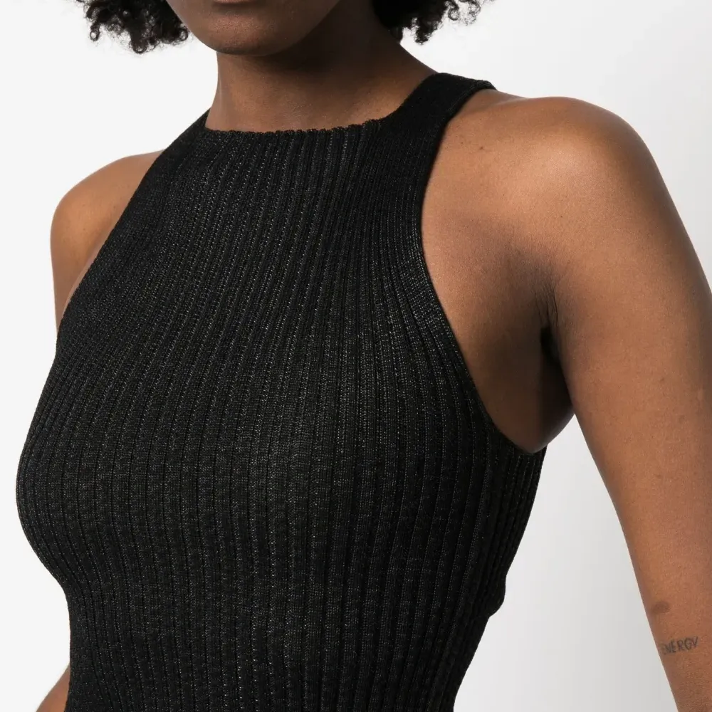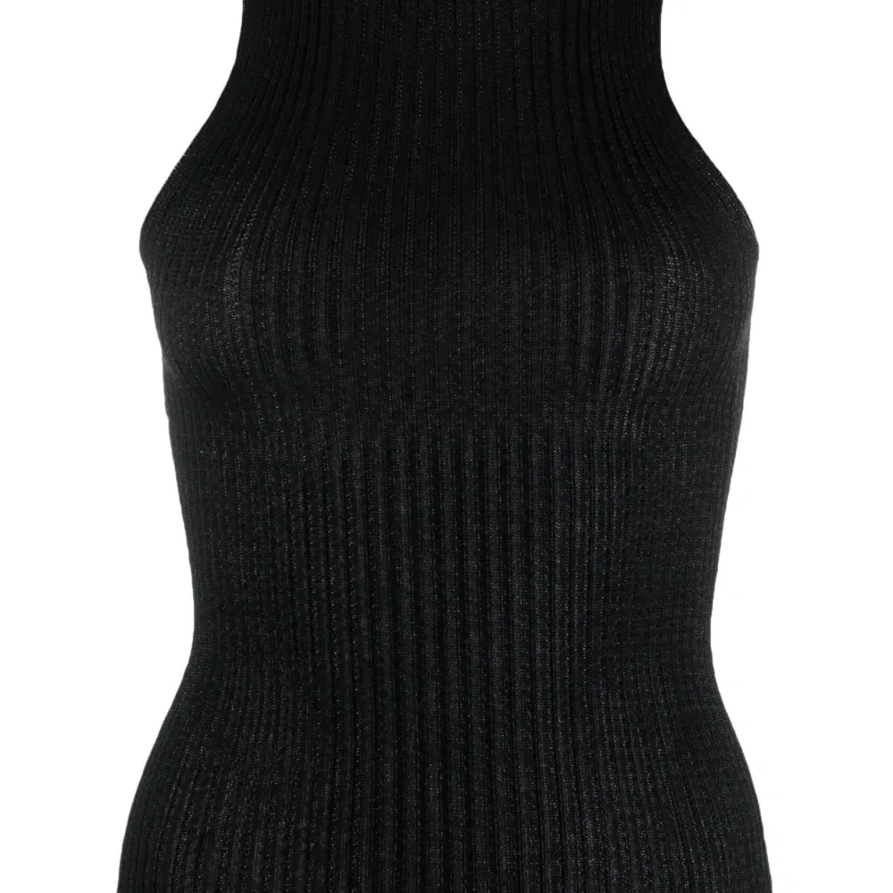 Черный, смесовый хлопок, трикотаж в рубчик, высокий воротник, без рукавов и прямой подол.