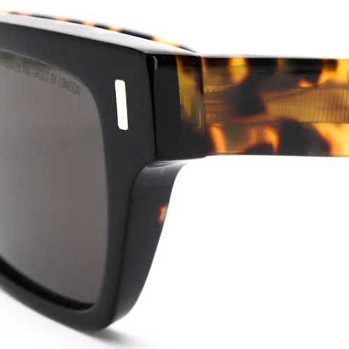 Солнцезащитные очки в квадратной оправе от Cutler & Gross. Затемненные линзы, серебристая фурнитура, прямые дужки с остро изогнутыми концами и детали из панциря черепахи. Прилагается защитный чехол. Модель в стиле унисекс.