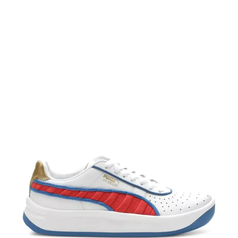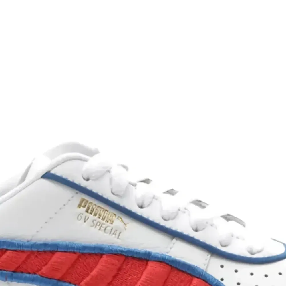 белый цвет, красные детали, синие детали, элементы золотистого цвета, перфорированные элементы, шнуровка