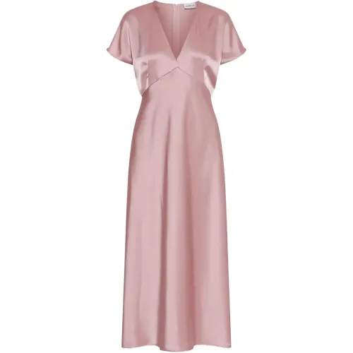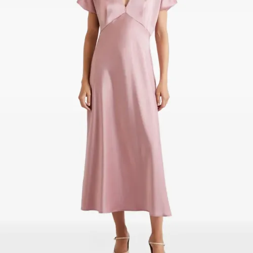 розовое платье с V-образным вырезом, атласной отделкой, застежкой-молнией сзади, силуэтом "А-силуэт" и короткими рукавами