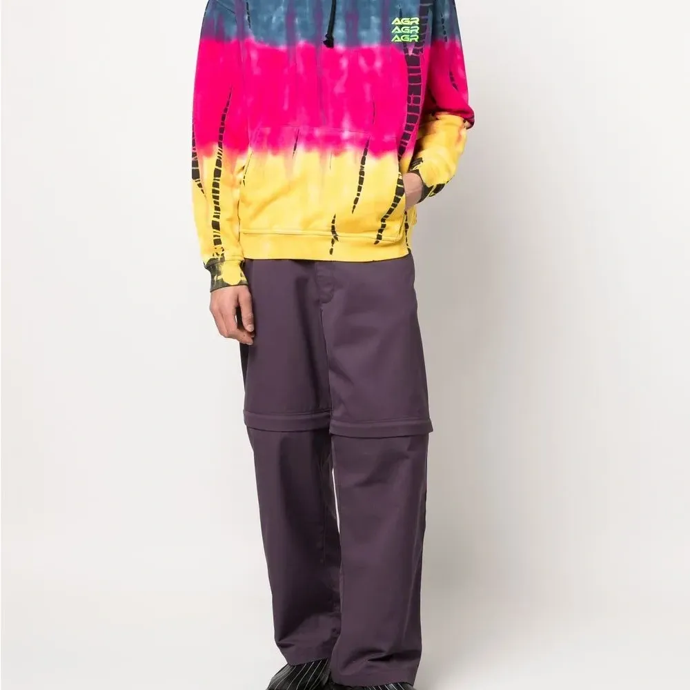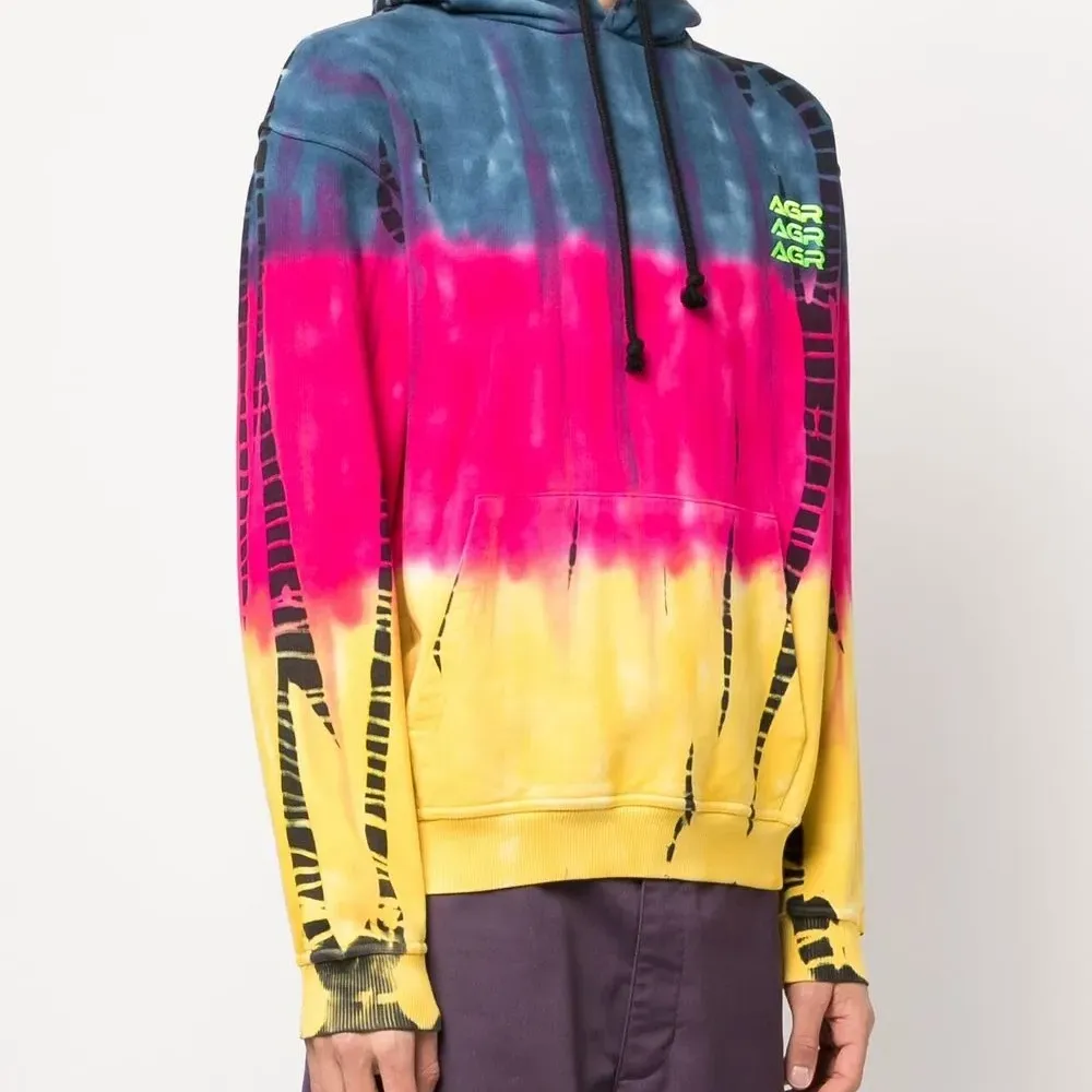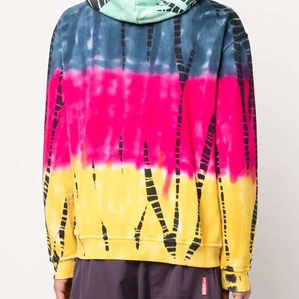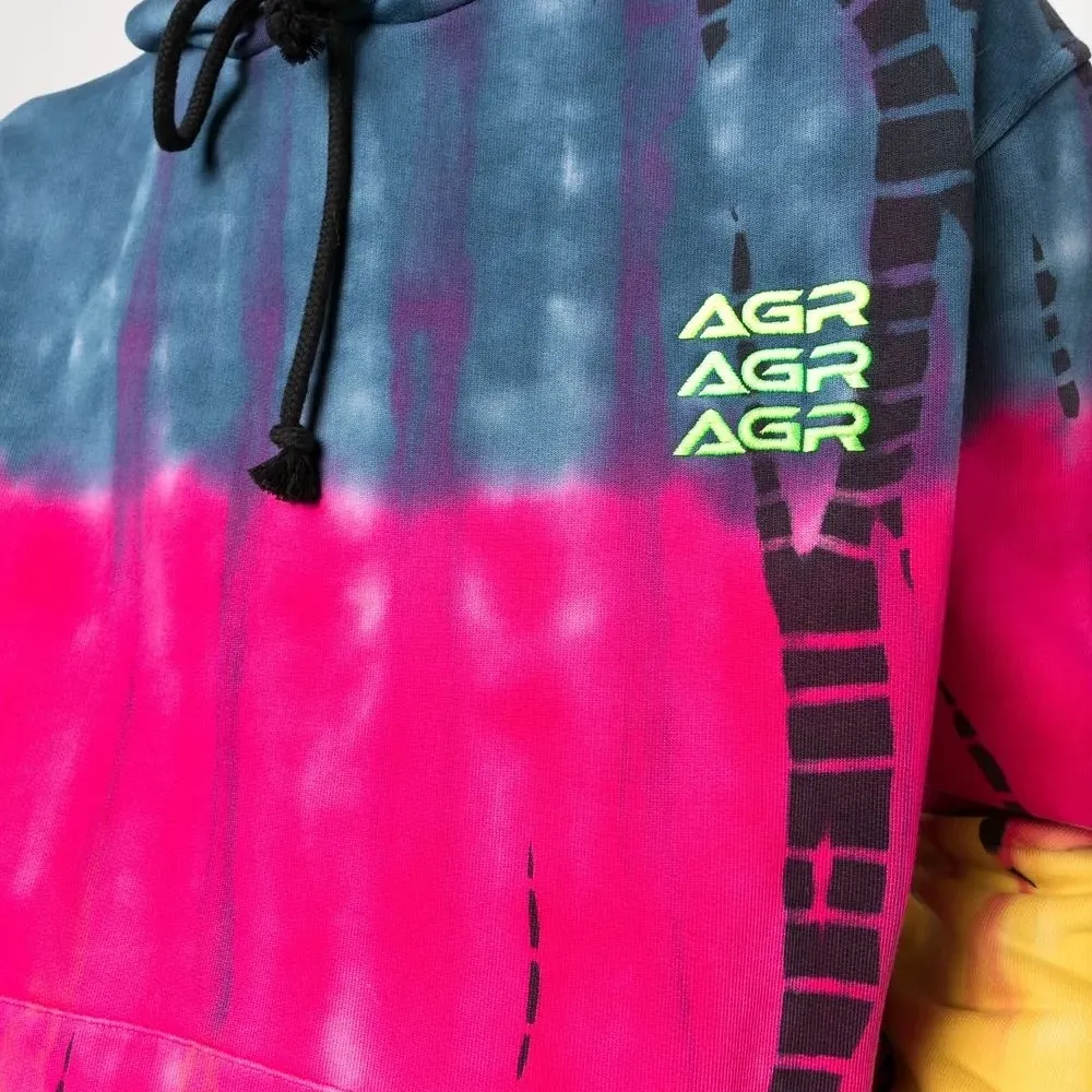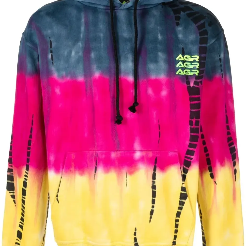Принт тай-дай, вышитый логотип на груди, затягивающийся на шнурок капюшон, длинные рукава, манжеты в рубчик и подол в рубчик.