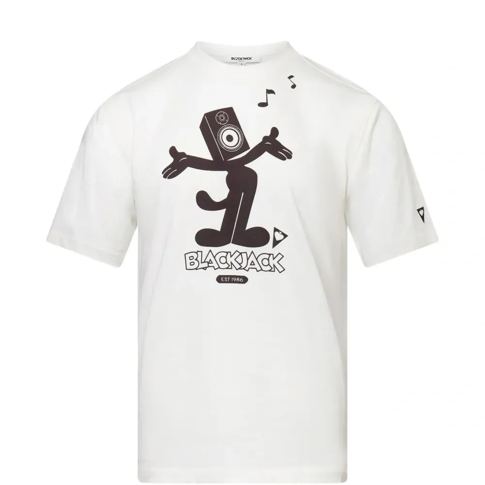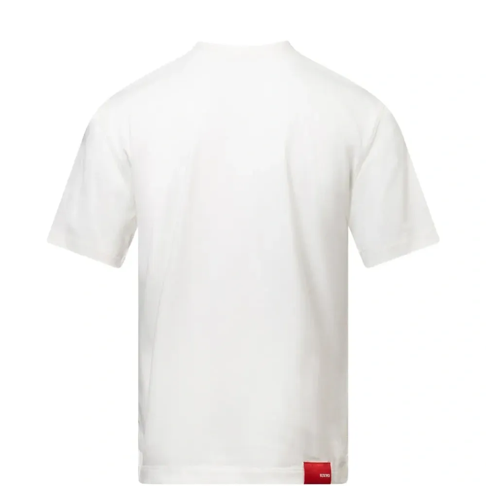 белая футболка с графическим принтом, короткими рукавами, круглым вырезом и нашивкой с логотипом