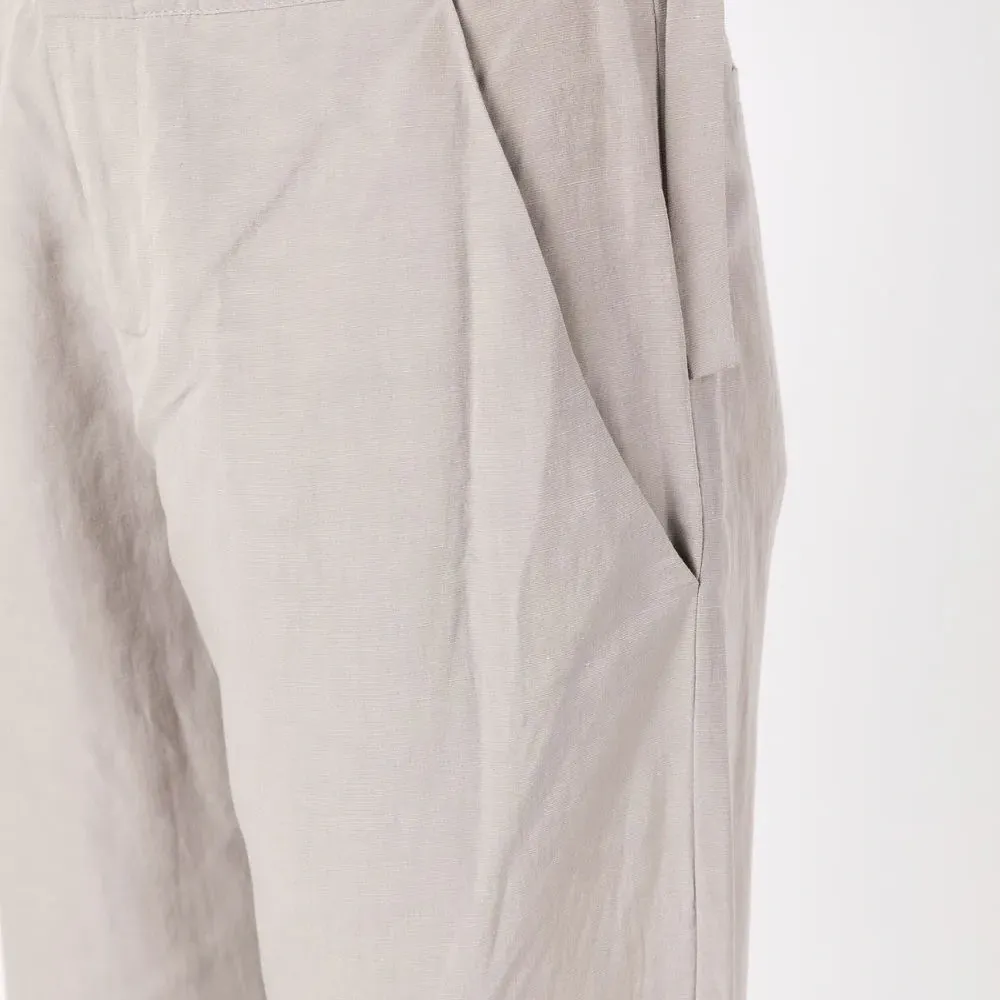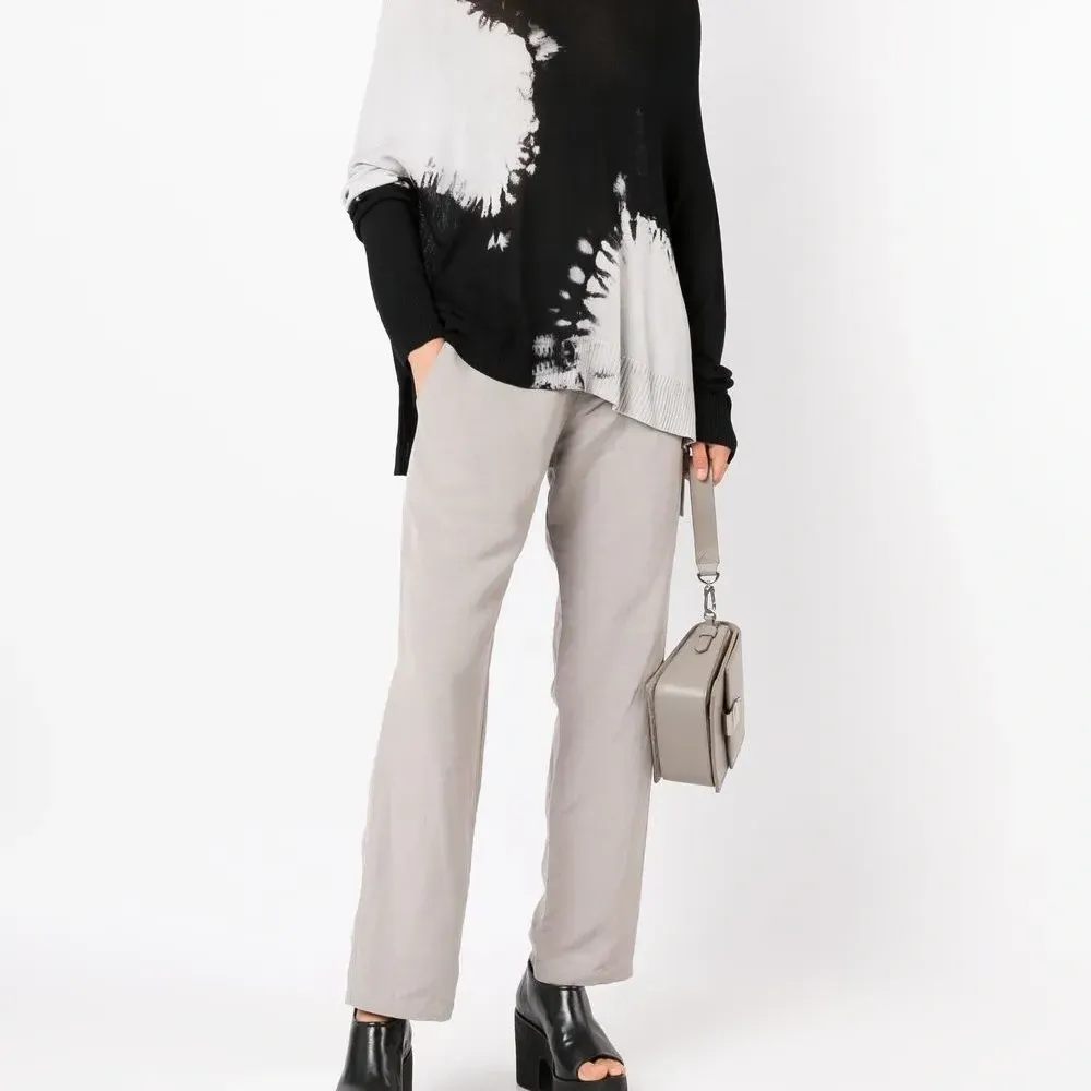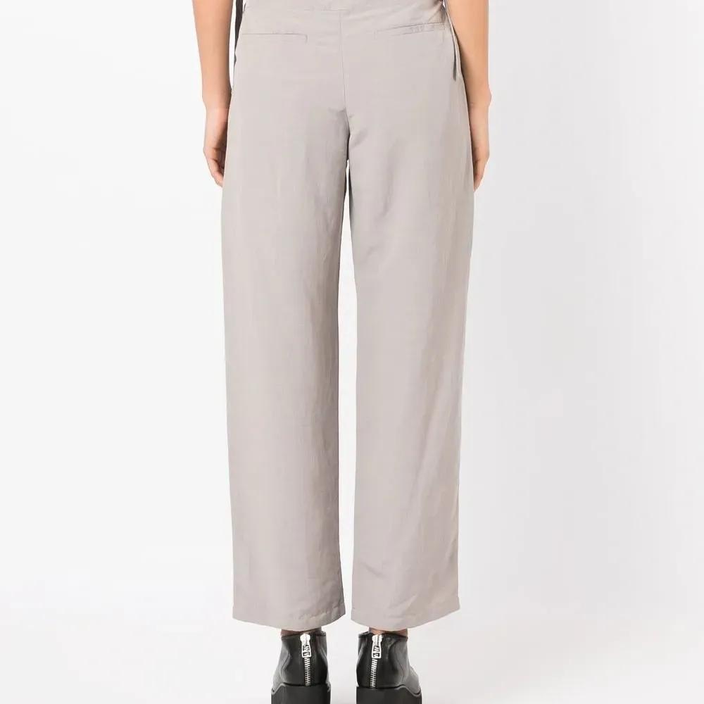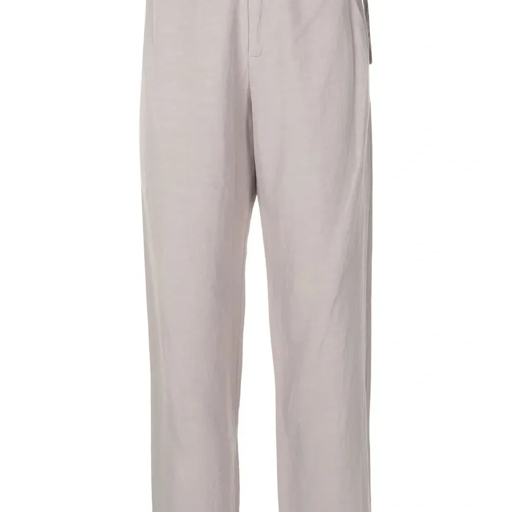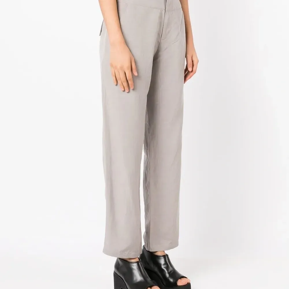 Серый, эластичный модал, завышенная талия, ширинка на молнии, регулируемые ремешки на поясе, два прорезных кармана по бокам, два кармана с листочкой сзади и прямой крой.