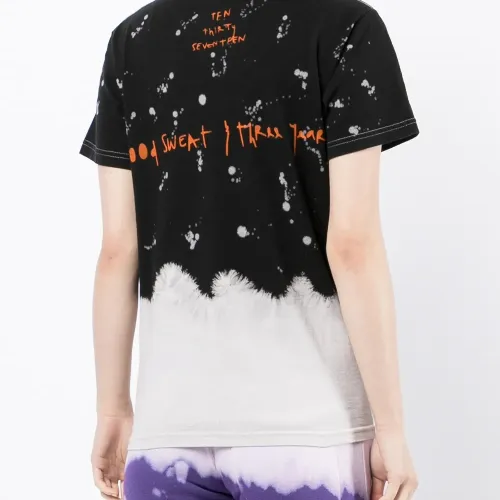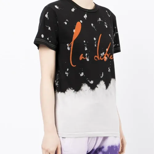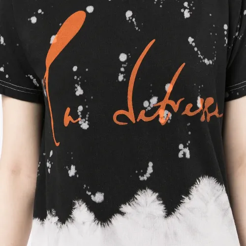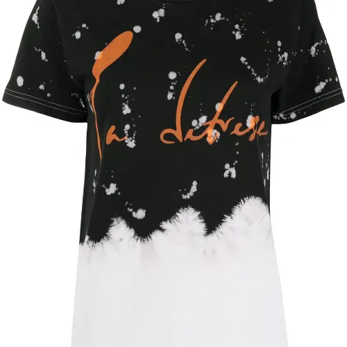 Абстрактный принт, логотип спереди, круглый вырез, короткие рукава и прямой подол.