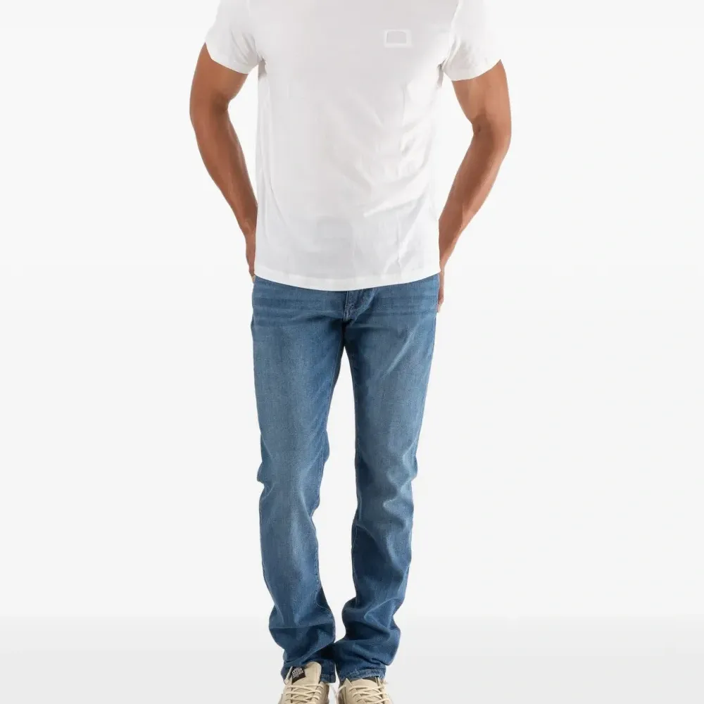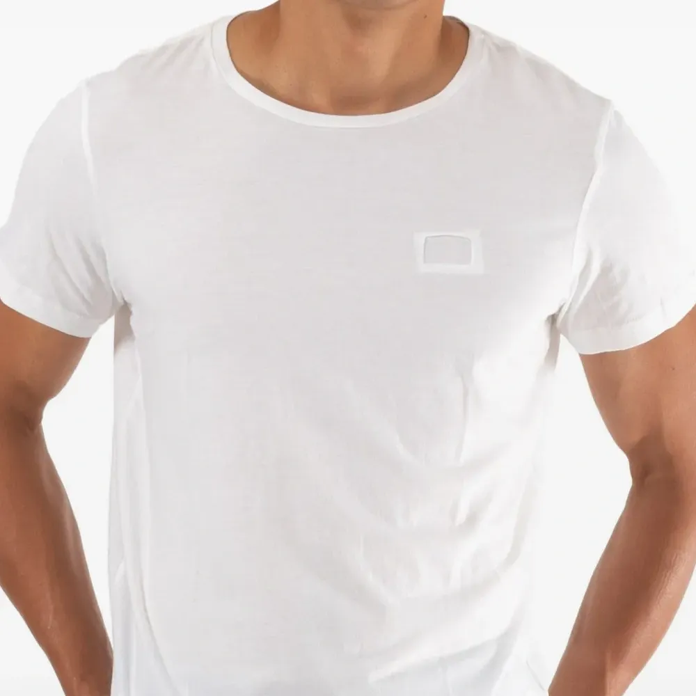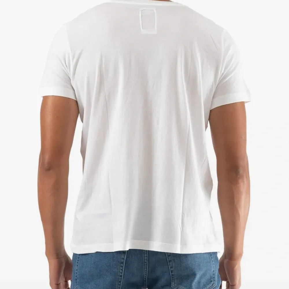белая футболка с нашивкой на груди, круглым вырезом и короткими рукавами