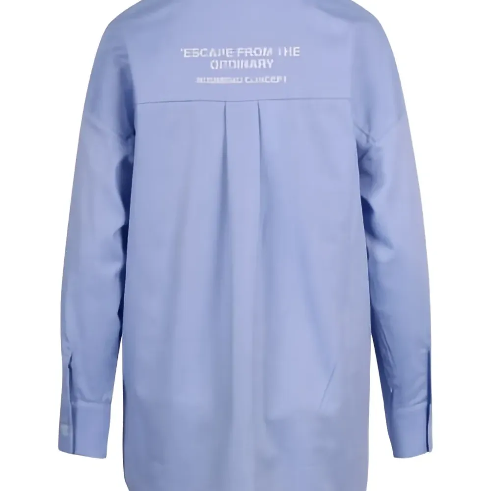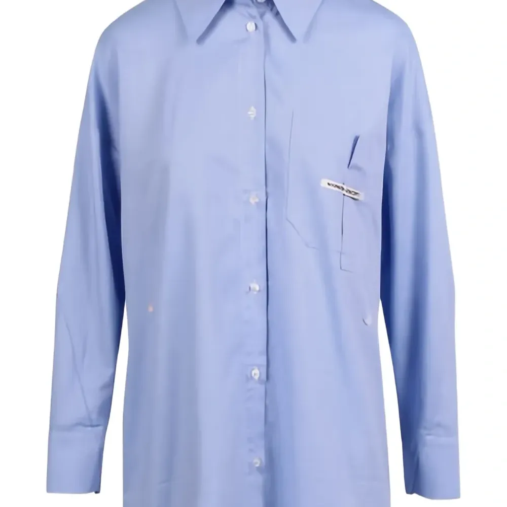 светло-голубая рубашка с нагрудным карманом, застежкой на пуговицы, длинными рукавами, манжетами на пуговицах и надписью
