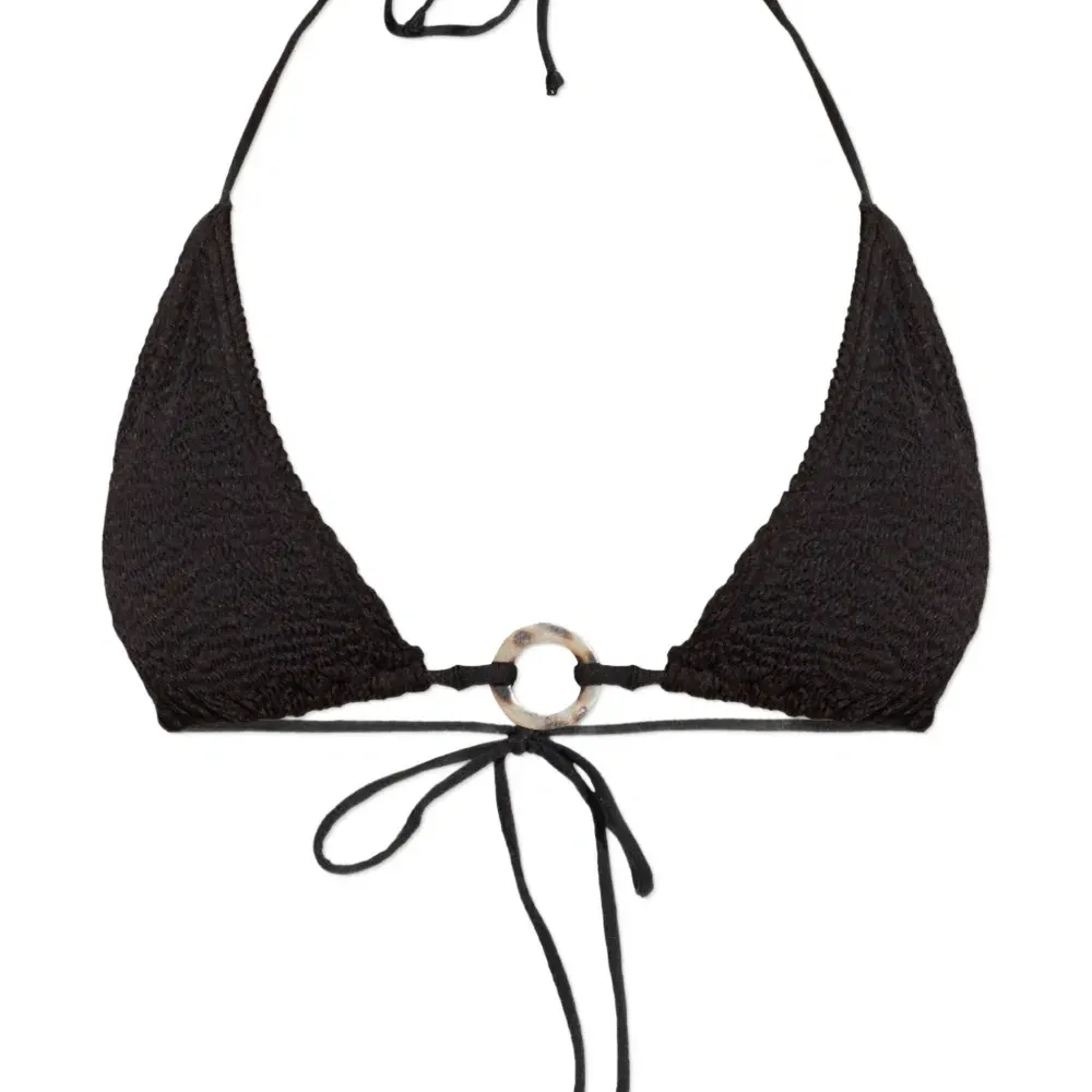 сияющая черная фактурная отделка, детали в виде кольца, завязки, треугольные чашечки. Пожалуйста, примерьте купальник поверх собственного белья.
