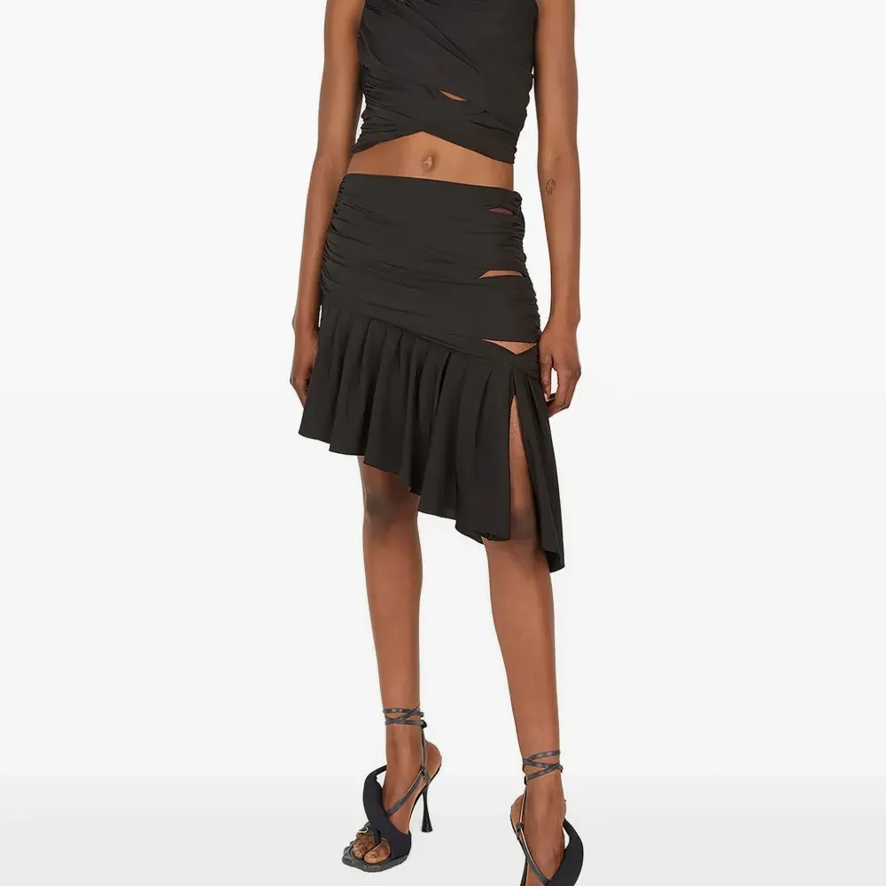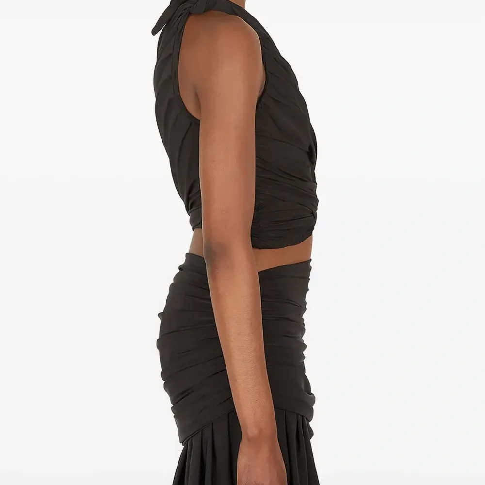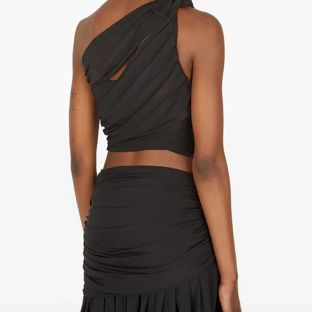 черный асимметричный вырез рукав с узлом декоративные вырезы драпировка по всей поверхности