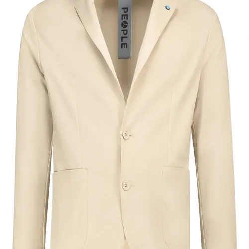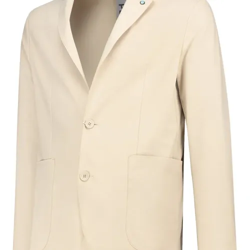 бежевый, застёгивается на пуговицы, лацканы с вырезом, накладные карманы спереди, манжеты на пуговицах